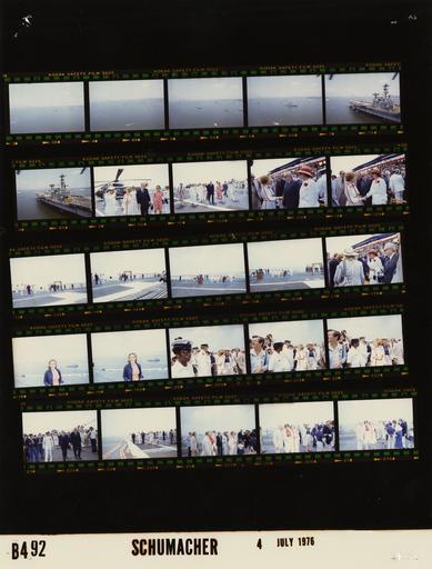 | Keywords: Ford B0492 NLGRF photo contact sheet (1976-07-04)(Gerald Ford Library).jpg White House Photographic Office WHPO is housed at the Gerald R Ford Presidential Library a branch of the National Archives and Records Administration NARA <br/><br/> This file is a 200 dpi photo contact sheet having images from roll of film B0492 of the August 9 1974 - January 20 1977 Gerald R Ford White House Photographic Office Series A0001-A9999 and B0001-B2886 photographs <br/><br/> The date on the photo contact sheet is the date the roll of film was processed not necessarily the date the photographs were taken See table below for additional details 1976-07-04 Gerald R Ford Presidential Library Image http //www fordlibrarymuseum gov/library/whphotos/B0492_NLGRF jpg B0492_NLGRF jpg from http //www fordlibrarymuseum gov/library/whphotos/19760704whpo pdf White House Photographs July 4 1976 of the http //www fordlibrarymuseum gov/Library/whphotos/whpo asp White House Photographic Collection page White House Photographic Office WHPO - Schumacher PD-USGov Institution Institution Gerald R Ford Presidential Library Table wikitable sortable + Photo contact sheet B0492 U S President Ford Administration Gerald R Ford Library Frame s Tone Subject proper Subject generic Names Geographic Location Photographer Date - 3A-6A Color 4th of July Bicentennial Event - First Lady's Flight Prior to Ringing of the Bicentennial Bell on the Flight Deck of the USS Forrestal CV-59 copter flying toward USS Forrestal not seen ; USS Richmond K Turner CE 20 at anchor in each frame New York Harbor New York City NY First Lady's Helicopter Schumacher 1976-07-04 - 7A-8A Color 4th of July Bicentennial Event - First Lady's Flight Prior to Ringing of the Bicentennial Bell on the Flight Deck of the USS Forrestal CV-59 copter flying toward USS Forrestal New York Harbor New York City NY First Lady's Helicopter Schumacher 1976-07-04 - 9A-10A Color 4th of July Bicentennial Event - First Lady's Arrival Prior to Ringing of the Bicentennial Bell on the Flight Deck of the USS Forrestal CV-59 ; Commander US Navy North Atlantic Fleet; Captain USS Forrestal greeting walking; First Lady's helicopter in 1st frame Betty Ford Adm Isaac Kidd Capt Joseph Barth Sec Mrs J William Middendorf New York Harbor New York City NY Flight Deck USS Forrestal CV59 Schumacher 1976-07-04 - 11A-12A Color 4th of July Bicentennial Event - Operation Sail Event Aboard the USS Forrestal CV-59 - Her Serene Highness The Princess of Monaco; Prince of Monaco BF and Grimaldis greeting handshaking; Princess wearing large bonnet and sunglasses; others in background Betty Ford Princess Grace Kelly Prince Rainier III Grimaldi ; Others New York Harbor New York City NY USS Forrestal CV-59 - Flight Deck Schumacher 1976-07-04 - 13A-14A Color 4th of July Bicentennial Event - Ringing of the Bicentennial Bell on the Flight Deck of the USS Forrestal CV-59 ; Administrator American Revolution Bicentennial Administration ARBA ; Captain USS Forrestal GRF and Warner standing next to Bicentennial Bell; GRF ringing bell; others seated to side or in background; all not in every frame; long shots GRF John Warner Betty Ford Adm Isaac Kidd Capt Joseph Barth Sec Mrs J William Middendorf Susan Ford; Naval Marine Personnel New York Harbor New York City NY USS Forrestal CV-59 - Flight Deck Schumacher 1976-07-04 - 15A-16A Color 4th of July Bicentennial Event - President's Remarks Following Ringing of the Bicentennial Bell on the Flight Deck of the USS Forrestal CV59 ; Commander US Navy North Atlantic Fleet; Captain USS Forrestal GRF at lectern speaking; others seated to side or in background; all not in every frame; long shots GRF John Warner Betty Ford Adm Isaac Kidd Capt Joseph Barth Sec Mrs J William Middendorf Susan Ford; Naval Marine Personnel New York Harbor New York City NY USS Forrestal CV-59 - Flight Deck Schumacher 1976-07-04 - 17A Color 4th of July Bicentennial Event - Operation Sail Event Aboard the USS Forrestal CV-59 - Her Serene Highness The Princess of Monaco; Prince of Monaco talking BF obscured; Susan's back to camera; Princess wearing large bonnet and sunglasses; others in background Betty Ford Princess Grace Kelly Prince Rainier III Grimaldi Susan Ford; Others New York Harbor New York City NY USS Forrestal CV-59 - Flight Deck Schumacher 1976-07-04 - 18-19A Color 4th of July Bicentennial Event - Following Ringing of the Bicentennial Bell and President's Remarks on the Flight Deck of the USS Forrestal CV-59 standing posing smiling Unidentified Girl New York Harbor New York City NY USS Forrestal CV-59 - Flight Deck Schumacher 1976-07-04 - 20A-22A Color 4th of July Bicentennial Event - Following Ringing of the Bicentennial Bell and President's Remarks on the Flight Deck of the USS Forrestal CV-59 greeting handshaking; all not in every frame Betty Ford Susan Ford; Naval Personnel; Others New York Harbor New York City NY USS Forrestal CV-59 - Flight Deck Schumacher 1976-07-04 - 23A Color 4th of July Bicentennial Event - Following Ringing of the Bicentennial Bell and President's Remarks on the Flight Deck of the USS Forrestal CV-59 walking talking GRF Others New York Harbor New York City NY USS Forrestal CV-59 - Flight Deck Schumacher 1976-07-04 - 24A-27A Color 4th of July Bicentennial Event - Following Ringing of the Bicentennial Bell and President's Remarks on the Flight Deck of the USS Forrestal CV-59 walking talking; all not in every frame GRF Betty Ford Adm Isaac Kidd Capt Joseph Barth Sec Mrs J William Middendorf Susan Ford; Naval Marine Personnel New York Harbor New York City NY USS Forrestal CV-59 - Flight Deck Schumacher 1976-07-04 Gerald R Ford Presidential Library and Museum-cooperation PD-USGov Contact sheets by the Ford White House July 1976 |