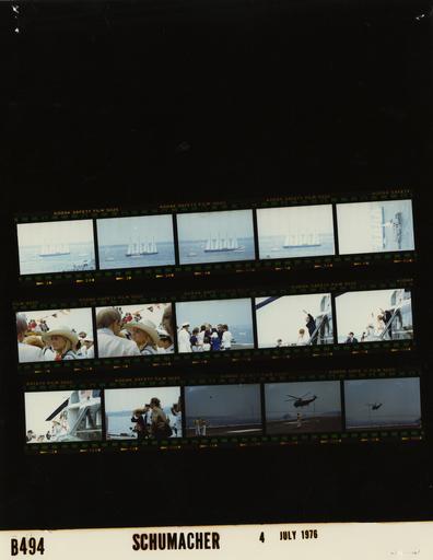 | Keywords: Ford B0494 NLGRF photo contact sheet (1976-07-04)(Gerald Ford Library).jpg White House Photographic Office WHPO is housed at the Gerald R Ford Presidential Library a branch of the National Archives and Records Administration NARA <br/><br/> This file is a 200 dpi photo contact sheet having images from roll of film B0494 of the August 9 1974 - January 20 1977 Gerald R Ford White House Photographic Office Series A0001-A9999 and B0001-B2886 photographs <br/><br/> The date on the photo contact sheet is the date the roll of film was processed not necessarily the date the photographs were taken See table below for additional details 1976-07-04 Gerald R Ford Presidential Library Image http //www fordlibrarymuseum gov/library/whphotos/B0494_NLGRF jpg B0494_NLGRF jpg from http //www fordlibrarymuseum gov/library/whphotos/19760704whpo pdf White House Photographs July 4 1976 of the http //www fordlibrarymuseum gov/Library/whphotos/whpo asp White House Photographic Collection page White House Photographic Office WHPO - Schumacher PD-USGov Institution Institution Gerald R Ford Presidential Library Table wikitable sortable + Photo contact sheet B0494 U S President Ford Administration Gerald R Ford Library Frame s Tone Subject proper Subject generic Names Geographic Location Photographer Date - 2-6 Color 4th of July Bicentennial Event - Operation Sail - Flight to USS Forrestal CV-59 Unidentified Tall Ship at full sail not listed in ship inventory ; tugboat in 1st and 5th frames; copter not in frames New York Harbor New York City NY Helicopter Schumacher 1976-07-04 - 7-8 Color 4th of July Bicentennial Event - Arrival on Deck of USS Forrestal CV-59 standing talking; man's back to camera; Susan wearing large sun hat; close ups Susan Ford; Unidentified Man New York Harbor New York City NY USS Forrestal CV-59 - Flight Deck Schumacher 1976-07-04 - 9 Color 4th of July Bicentennial Event - Arrival on Deck of USS Forrestal CV-59 greeting handshaking smiling talking; all not in frame GRF Children Adults Naval Officer New York Harbor New York City NY USS Forrestal CV-59 - Flight Deck Schumacher 1976-07-04 - 10-11 Color 4th of July Bicentennial Event - Prior to Departure from USS Forrestal CV-59 for Flight to USS Nashville LPD-13 GRF and BF standing in doorway of Marine One waving; Susan at base of steps in 2nd frame GRF Betty Ford; Susan Ford New York Harbor New York City NY USS Forrestal CV-59 - Flight Deck Schumacher 1976-07-04 - 12 Color 4th of July Bicentennial Event - Prior to Departure from USS Forrestal CV-59 for Flight to USS Nashville LPD-13 standing in doorway of Marine One waving; wearing large sunhat Susan Ford New York Harbor New York City NY USS Forrestal CV-59 - Flight Deck Schumacher 1976-07-04 - 13 Color 4th of July Bicentennial Event - Departure from USS Forrestal CV-59 for Flight to USS Nashville LPD-13 Watching Marine One not shown take off; all not in frames Small Group of People New York Harbor New York City NY USS Forrestal CV-59 - Flight Deck Schumacher 1976-07-04 - 14 Color 4th of July Bicentennial Event - Departure from USS Forrestal CV-59 for Flight to USS Nashville LPD-13 Men on flight deck; Marine One in flight in distance; Verazanno Narrows bridge in background Two Navy Personnel New York Harbor New York City NY USS Forrestal CV-59 - Flight Deck Schumacher 1976-07-04 - 15-16 Color 4th of July Bicentennial Event - Departure from USS Forrestal CV-59 for Flight to USS Nashville LPD-13 helicopter in flight; Verazanno Narrows bridge in background New York Harbor New York City NY USS Forrestal CV-59 - Flight Deck Schumacher 1976-07-04 Gerald R Ford Presidential Library and Museum-cooperation PD-USGov Contact sheets by the Ford White House July 1976 |