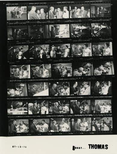 Keywords: Ford B0657 NLGRF photo contact sheet (1976-07-13)(Gerald Ford Library).jpg White House Photographic Office WHPO is housed at the Gerald R Ford Presidential Library a branch of the National Archives and Records Administration NARA <br/><br/> This file is a 200 dpi photo contact sheet having images from roll of film B0657 of the August 9 1974 - January 20 1977 Gerald R Ford White House Photographic Office Series A0001-A9999 and B0001-B2886 photographs <br/><br/> The date on the photo contact sheet is the date the roll of film was processed not necessarily the date the photographs were taken See table below for additional details 1976-07-13 Gerald R Ford Presidential Library Image http //www fordlibrarymuseum gov/library/whphotos/B0657_NLGRF jpg B0657_NLGRF jpg from http //www fordlibrarymuseum gov/library/whphotos/19760713whpo pdf White House Photographs July 13 1976 of the http //www fordlibrarymuseum gov/Library/whphotos/whpo asp White House Photographic Collection page White House Photographic Office WHPO - Thomas PD-USGov Institution Institution Gerald R Ford Presidential Library Table wikitable sortable + Photo contact sheet B0657 U S President Ford Administration Gerald R Ford Library Frame s Tone Subject proper Subject generic Names Geographic Location Photographer Date - 3 BW Trip to Pennsylvania -Arrival in Philadelphia for Major League Baseball All-Star Game - Manager Philadelphia International Airport GRF and Rogers greeting at the base of steps to Air Force One; others standing nearby GRF Charles Rogers Ernie Banks Alan Greenspan Jack Ford Others Philadelphia PA Philadelphia International Airport Thomas 1976-07-13 - 4-6 BW Trip to Pennsylvania -Reception Hosted by Commisioner Kuhn Prior to Major League Baseball All-Star Game - Owners Philadephia Phillies Baseball Club greeting handshaking standing talking; all not in frames GRF Mr Mrs Bowie Kuhn Bob Carpenter Ruly Carpenter Others Philadelphia PA Executive Dining - Veterans Memorial Stadium Thomas 1976-07-13 - 7-9 BW Trip to Pennsylvania -Reception Hosted by Commisioner Kuhn Prior to Major League Baseball All-Star Game - Commissioner Major League Baseball standing talking GRF Bowie Kuhn Philadelphia PA Executive Dining - Veterans Memorial Stadium Thomas 1976-07-13 - 10 BW Trip to Pennsylvania -Reception Hosted by Commisioner Kuhn Prior to Major League Baseball All-Star Game greeting handshaking GRF Unidentified Woman Philadelphia PA Executive Dining - Veterans Memorial Stadium Thomas 1976-07-13 - 11-12 BW Trip to Pennsylvania -Prior to Major League Baseball All-Star Game - Outfielder New York Mets standing talking; GRF autographing baseball in 1st frame GRF Dave Kingman Philadelphia PA Veterans Memorial Stadium - National League Locker Room Thomas 1976-07-13 - 13-14 BW Trip to Pennsylvania -Prior to Major League Baseball All-Star Game - Outfielder Pittsburgh Pirates standing talking; holding baseball between them GRF Al Oliver Philadelphia PA Veterans Memorial Stadium - National League Locker Room Thomas 1976-07-13 - 15 BW Trip to Pennsylvania - Prior to Major League Baseball All-Star Game - Manager of Cincinnati Reds; Infielder Cincinnati Reds GRF talking to Concepcion; Anderson standing nearby Kuhn behind GRF; others in background GRF George Sparky Anderson Dave Concepcion Bowie Kuhn; Others Philadelphia PA Veterans Memorial Stadium -National League Locker Room Thomas 1976-07-13 - 16-17 BW Trip to Pennsylvania -Prior to Major League Baseball All-Star Game - Infielder Cincinnati Reds standing talking; GRF autographing baseball in 1st frame GRF Dave Concepcion Philadelphia PA Veterans Memorial Stadium - National League Locker Room Thomas 1976-07-13 - 18 BW Trip to Pennsylvania -Prior to Major League Baseball All-Star Game - Catcher Philadelphia Phillies standing talking; GRF autographing baseball GRF Bob Boone Philadelphia PA Veterans Memorial Stadium - National League Locker Room Thomas 1976-07-13 - 19 BW Trip to Pennsylvania -Prior to Major League Baseball All-Star Game - Catcher Cincinnati Reds standing talking; GRF autographing baseball GRF Johnny Bench Philadelphia PA Veterans Memorial Stadium - National League Locker Room Thomas 1976-07-13 - 20-23 BW Trip to Pennsylvania -Prior to Major League Baseball All-Star Game - Manager of Cincinnati Reds; Infielder Cincinnati Reds standing talking; Rose holding Petey Petey wearing baseball cap; Anderson in 2nd and 2rd frames back to camera GRF George Sparky Anderson Pete Rose Pete Petey Rose Jr Philadelphia PA Veterans Memorial Stadium - National League Locker Room Thomas 1976-07-13 - 24 BW Trip to Pennsylvania - Prior to Major League Baseball All-Star Game - Outfielder Philadelphia Phillies standing talking; GRF holding ink pen GRF Greg Luzinski Philadelphia PA Veterans Memorial Stadium -National League Locker Room Thomas 1976-07-13 - 25 BW Trip to Pennsylvania -Prior to Major League Baseball All-Star Game - Infielders Philadelphia Phillies standing talking; GRF autographing baseball for Cash GRF Larry Bowa Dave Cash Philadelphia PA Veterans Memorial Stadium - National League Locker Room Thomas 1976-07-13 - 26-27 BW Trip to Pennsylvania - Prior to Major League Baseball All-Star Game - Infielder Philadelphia Phillies standing talking; GRF autographing baseball for Man GRF Dave Cash; Unidentified Man Philadelphia PA Veterans Memorial Stadium -National League Locker Room Thomas 1976-07-13 - 28 BW Trip to Pennsylvania -Prior to Major League Baseball All-Star Game - Pitcher Los Angeles Dodgers standing talking GRF Don Sutton Philadelphia PA Veterans Memorial Stadium - National League Locker Room Thomas 1976-07-13 - 29 BW Trip to Pennsylvania -Prior to Major League Baseball All-Star Game - Pitcher San Francisco Giants GRF talking to Montefusco; Anderson and Kuhn in 2nd frame only GRF John Montefusco; George Sparky Anderson Bowie Kuhn Philadelphia PA Veterans Memorial Stadium - National League Locker Room Thomas 1976-07-13 - 30 BW Trip to Pennsylvania -Prior to Major League Bas