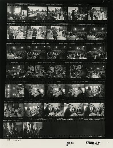 | Keywords: Ford B0726 NLGRF photo contact sheet (1976-07-17)(Gerald Ford Library).jpg White House Photographic Office WHPO is housed at the Gerald R Ford Presidential Library a branch of the National Archives and Records Administration NARA <br/><br/> This file is a 200 dpi photo contact sheet having images from roll of film B0726 of the August 9 1974 - January 20 1977 Gerald R Ford White House Photographic Office Series A0001-A9999 and B0001-B2886 photographs <br/><br/> The date on the photo contact sheet is the date the roll of film was processed not necessarily the date the photographs were taken See table below for additional details 1976-07-17 Gerald R Ford Presidential Library Image http //www fordlibrarymuseum gov/library/whphotos/B0726_NLGRF jpg B0726_NLGRF jpg from http //www fordlibrarymuseum gov/library/whphotos/19760717whpo pdf White House Photographs July 17 1976 of the http //www fordlibrarymuseum gov/Library/whphotos/whpo asp White House Photographic Collection page White House Photographic Office WHPO <br/> Creator David Hume Kennerly PD-USGov Institution Institution Gerald R Ford Presidential Library Table wikitable sortable + Photo contact sheet B0726 U S President Ford Administration Gerald R Ford Library Frame s Tone Subject proper Subject generic Names Geographic Location Photographer Date - 2 BW Jack Ford Campaign Trip to Hartford Connecticut Jack Ford and unidentified man seated; one man lying on bed another seated on edge; television on Jack Ford Others Hartford CT Hilton Hotel - President's Suite Kennerly 1976-07-17 - 3-5 BW Campaign Trip to Hartford Connecticut -Arrival for Address at Connecticut Republican Convention GRF walking waving smiling; crowd in background; all not in both frames GRF O'Donnell Sceret Service Others Crowd Hartford CT Bushnell Memorial Hall - Outside Kennerly 1976-07-17 - 6 BW Campaign Trip to Hartford Connecticut - Arrival for Address at Connecticut Republican Convention GRF greeting handshaking; Bailey in foreground GRF Pearl Bailey Others Hartford CT Bushnell Memorial Hall - Outside Kennerly 1976-07-17 - 7-9 BW Campaign Trip to Hartford Connecticut - Arrival for Address at Connecticut Republican Convention - Entertainer GRF and Bailey greeting handshaking embracing GRF Pearl Bailey Others Hartford CT Bushnell Memorial Hall - Outside Kennerly 1976-07-17 - 10-17 BW Campaign Trip to Hartford Connecticut -Addressing Connecticut Republican Convention GRF standing at lectern speaking; various angles and distances; all not in every frame GRF Platform guests; Crowd Hartford CT Bushnell Memorial Hall Kennerly 1976-07-17 - 18-20 BW Campaign Trip to Hartford Connecticut - Addressing Connecticut Republican Convention seated listening taking photographs taking notes; sound or video panel in foreground; all not in frames Media Hartford CT Bushnell Memorial Hall Kennerly 1976-07-17 - 21-22 BW Campaign Trip to Hartford Connecticut - Addressing Connecticut Republican Convention GRF standing at lectern speaking; crowd in foreground; long shot taken down center aisle from back of room GRF Platform guests; Crowd Hartford CT Bushnell Memorial Hall Kennerly 1976-07-17 - 23-26 BW Campaign Trip to Hartford Connecticut - Return Flight to Andrew's Air Force Base - Entertainer seated talking eating lunch; various angles GRF Pearl Bailey Air Force One - President's Cabin Kennerly 1976-07-17 - 27 BW Campaign Trip to Hartford Connecticut - Return Flight to Andrew's Air Force Base - Governor of North Carolina seated eating lunch; GRF seated at table Holshauser seated on sofa tray on lap GRF Gov James Holshauser Air Force One - President's Cabin Kennerly 1976-07-17 - 28 BW Campaign Trip to Hartford Connecticut -Return Flight to Andrew's Air Force Base - Entertainer seated talking eating lunch GRF Pearl Bailey Air Force One - President's Cabin Kennerly 1976-07-17 - 29-31 BW Flight from Andrews Air Force Base Following Campaign Trip to Hartford Connecticut seated talking; copter GRF Nessen Cheney Jack Ford Marine One Kennerly 1976-07-17 - 32-33 BW Flight from Andrews Air Force Base Following Campaign Trip to Hartford Connecticut seated; Barrett in foreground face distorted by curved camera lens; copter Barrett Lukash Marine One Kennerly 1976-07-17 Gerald R Ford Presidential Library and Museum-cooperation PD-USGov Contact sheets by the Ford White House July 1976 Photographs by David Hume Kennerly from 1976 |