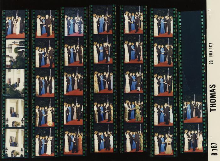 | Keywords: Ford B0767 NLGRF photo contact sheet (1976-07-20)(Gerald Ford Library).jpg White House Photographic Office WHPO is housed at the Gerald R Ford Presidential Library a branch of the National Archives and Records Administration NARA <br/><br/> This file is a 200 dpi photo contact sheet having images from roll of film B0767 of the August 9 1974 - January 20 1977 Gerald R Ford White House Photographic Office Series A0001-A9999 and B0001-B2886 photographs <br/><br/> The date on the photo contact sheet is the date the roll of film was processed not necessarily the date the photographs were taken See table below for additional details 1976-07-20 Gerald R Ford Presidential Library Image http //www fordlibrarymuseum gov/library/whphotos/B0767_NLGRF jpg B0767_NLGRF jpg from http //www fordlibrarymuseum gov/library/whphotos/19760720whpo pdf White House Photographs July 20 1976 of the http //www fordlibrarymuseum gov/Library/whphotos/whpo asp White House Photographic Collection page White House Photographic Office WHPO - Thomas PD-USGov Institution Institution Gerald R Ford Presidential Library Table wikitable sortable + Photo contact sheet B0767 U S President Ford Administration Gerald R Ford Library Frame s Tone Subject proper Subject generic Names Geographic Location Photographer Date - 3-6 Color Arrival for Concert and Reception for Members of the Diplomatic Corps to Celebrate the American Revolution Bicentennial GRF and BF standing on Truman Balcony in 1st 2 frames descending steps from Truman Balcony in last 2 frames; white tie formal wear GRF Betty Ford Military Honor Guard South Driveway Thomas 1976-07-20 - 7-34 Color Receiving Line for Concert and Reception for Members of the Diplomatic Corps to Celebrate the American Revolution Bicentennial greeting handshaking standing talking; various angles and distances; all not in every frame; white tie formal wear GRF Betty Ford Henry Nancy Kissinger; Guests South Lawn Thomas 1976-07-20 Gerald R Ford Presidential Library and Museum-cooperation PD-USGov Contact sheets by the Ford White House July 1976 |