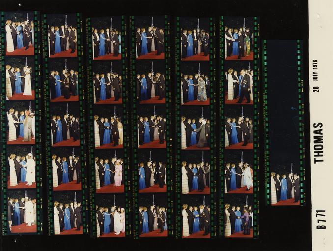 | Keywords: Ford B0771 NLGRF photo contact sheet (1976-07-20)(Gerald Ford Library).jpg White House Photographic Office WHPO is housed at the Gerald R Ford Presidential Library a branch of the National Archives and Records Administration NARA <br/><br/> This file is a 200 dpi photo contact sheet having images from roll of film B0771 of the August 9 1974 - January 20 1977 Gerald R Ford White House Photographic Office Series A0001-A9999 and B0001-B2886 photographs <br/><br/> The date on the photo contact sheet is the date the roll of film was processed not necessarily the date the photographs were taken See table below for additional details 1976-07-20 Gerald R Ford Presidential Library Image http //www fordlibrarymuseum gov/library/whphotos/B0771_NLGRF jpg B0771_NLGRF jpg from http //www fordlibrarymuseum gov/library/whphotos/19760720whpo pdf White House Photographs July 20 1976 of the http //www fordlibrarymuseum gov/Library/whphotos/whpo asp White House Photographic Collection page White House Photographic Office WHPO - Thomas PD-USGov Institution Institution Gerald R Ford Presidential Library Table wikitable sortable + Photo contact sheet B0771 U S President Ford Administration Gerald R Ford Library Frame s Tone Subject proper Subject generic Names Geographic Location Photographer Date - 4-34 Color Receiving Line for Concert and Reception for Members of the Diplomatic Corps to Celebrate the American Revolution Bicentennial greeting handshaking standing talking; various angles and distances; all not in every frame; white tie formal wear GRF Betty Ford Henry Nancy Kissinger; Guests South Lawn Thomas 1976-07-20 Gerald R Ford Presidential Library and Museum-cooperation PD-USGov Contact sheets by the Ford White House July 1976 |