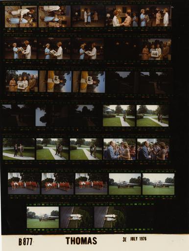 | Keywords: Ford B0877 NLGRF photo contact sheet (1976-07-30)(Gerald Ford Library).jpg White House Photographic Office WHPO is housed at the Gerald R Ford Presidential Library a branch of the National Archives and Records Administration NARA <br/><br/> This file is a 200 dpi photo contact sheet having images from roll of film B0877 of the August 9 1974 - January 20 1977 Gerald R Ford White House Photographic Office Series A0001-A9999 and B0001-B2886 photographs <br/><br/> The date on the photo contact sheet is the date the roll of film was processed not necessarily the date the photographs were taken See table below for additional details 1976-07-30 Gerald R Ford Presidential Library Image http //www fordlibrarymuseum gov/library/whphotos/B0877_NLGRF jpg B0877_NLGRF jpg from http //www fordlibrarymuseum gov/library/whphotos/19760730whpo pdf White House Photographs July 30 1976 of the http //www fordlibrarymuseum gov/Library/whphotos/whpo asp White House Photographic Collection page White House Photographic Office WHPO - Schumacher PD-USGov Institution Institution Gerald R Ford Presidential Library Table wikitable sortable + Photo contact sheet B0877 U S President Ford Administration Gerald R Ford Library Frame s Tone Subject proper Subject generic Names Geographic Location Photographer Date - 4-7 Color Prior to Presentation of Stoddard Needlepoint A needlepoint picture of the Alexandria Home of Pres Mrs Ford linen matted off white and in silver antiqued wood frame Meas 16 x 19 greeting handshaking standing talking; only BF in every frame Betty Ford Mrs Waldo Stoddard Mrs Osier Nelson Diplomatic Reception Room Schumacher 1976-07-30 - 8 Color Prior to Presentation of Stoddard Needlepoint A needlepoint picture of the Alexandria Home of Pres Mrs Ford linen matted off white and in silver antiqued wood frame Meas 16 x 19 standing; Stoddard holding framed needlepoint Betty Ford Mrs Waldo Stoddard Mrs Osier Nelson Diplomatic Reception Room Schumacher 1976-07-30 - 9-11 Color Prior to Presentation of Stoddard Needlepoint A needlepoint picture of the Alexandria Home of Pres Mrs Ford linen matted off white and in silver antiqued wood frame Meas 16 x 19 standing BF receiving framed needlepoint Betty Ford Mrs Waldo Stoddard Diplomatic Reception Room Schumacher 1976-07-30 - 12 Color Schumacher 1976-07-30 - 13-14 Color Prior to Presentation of Stoddard Needlepoint A needlepoint picture of the Alexandria Home of Pres Mrs Ford linen matted off white and in silver antiqued wood frame Meas 16 x 19 standing posing; BF holding framed needlepoint Betty Ford Mrs Waldo Stoddard Mrs Osier Nelson Unidentified Man Diplomatic Reception Room Schumacher 1976-07-30 - 15-16 Color Prior to Presentation of Stoddard Needlepoint A needlepoint picture of the Alexandria Home of Pres Mrs Ford linen matted off white and in silver antiqued wood frame Meas 16 x 19 standing posing holding framed needlepoint Betty Ford Diplomatic Reception Room Schumacher 1976-07-30 - 17-26 Color standing talking looking at documents; both holding briefcases Cheney Rumsfeld Sidewalk between Oval Office and South Driveway Schumacher 1976-07-30 - 27-28 Color Meeting on South Driveway GRF greeting handshaking with woman in foreground; others in background GRF Unidentified Woman; Others South Driveway Schumacher 1976-07-30 - 29-31 Color Meeting with Christian Youth Fellowship Bicyclists Who Bicycled from Grand Rapids Michigan to Washington DC standing posing; Truman Balcony South Portico and others in background GRF Betty Ford Christian Youth Fellowship Bicyclists; Others South Driveway Schumacher 1976-07-30 - 32-34 Color Prior to Departure for Andrews Air Force Base Maryland GRF and BF walking up steps to Marine One in 1st frame; standing waving from steps of helicopter in last 2 frames; long shots; Washington Monument in background GRF Betty Ford Others South Lawn Schumacher 1976-07-30 - 35-36 Color Watching Departure of Marine One for Andrews Air Force Base Maryland standing near hedge watching departure of Marine One not shown ; one woman shading eyes with hand Two Unidentified Women South Driveway Schumacher 1976-07-30 Gerald R Ford Presidential Library and Museum-cooperation PD-USGov Contact sheets by the Ford White House July 1976 |
