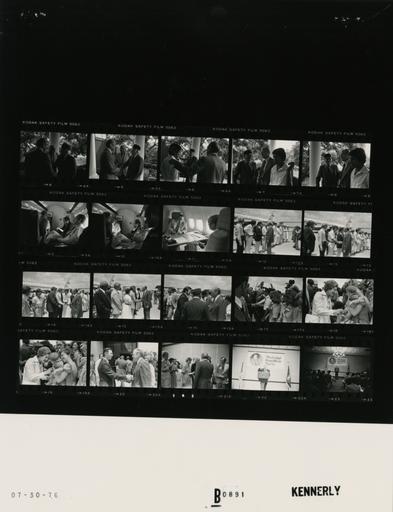 | Keywords: Ford B0891 NLGRF photo contact sheet (1976-07-30)(Gerald Ford Library).jpg White House Photographic Office WHPO is housed at the Gerald R Ford Presidential Library a branch of the National Archives and Records Administration NARA <br/><br/> This file is a 200 dpi photo contact sheet having images from roll of film B0891 of the August 9 1974 - January 20 1977 Gerald R Ford White House Photographic Office Series A0001-A9999 and B0001-B2886 photographs <br/><br/> The date on the photo contact sheet is the date the roll of film was processed not necessarily the date the photographs were taken See table below for additional details 1976-07-30 Gerald R Ford Presidential Library Image http //www fordlibrarymuseum gov/library/whphotos/B0891_NLGRF jpg B0891_NLGRF jpg from http //www fordlibrarymuseum gov/library/whphotos/19760730whpo pdf White House Photographs July 30 1976 of the http //www fordlibrarymuseum gov/Library/whphotos/whpo asp White House Photographic Collection page White House Photographic Office WHPO <br/> Creator David Hume Kennerly PD-USGov Institution Institution Gerald R Ford Presidential Library Table wikitable sortable + Photo contact sheet B0891 U S President Ford Administration Gerald R Ford Library Frame s Tone Subject proper Subject generic Names Geographic Location Photographer Date - 4-8 BW Informal Meeting with Washington Post Photographer Father and Son greeting handshaking standing talking laughing; Neshan wearing wool hat; various angles and distances; all not in every frame GRF Harry Naltchayan Neshan Naltchayan Harry Naltchayan's Son Patio near Oval Office Kennerly 1976-07-30 - 9-10 BW Flight to Andrews Air Force Base Prior to Campaign Trip to Mississippi to Meet Mississippi Delegates and Alternates to the Republican National Convention seated talking; GRF's back to camera GRF Betty Ford Cheney Nessen Marine One Kennerly 1976-07-30 - 11 BW Flight From Andrews Air Force Base Maryland to Jackson Mississippi; Interview with Newsweek Correspondent seated at table talking; various angles and distances GRF Tom DeFrank Air Force One - President's Cabin Kennerly 1976-07-30 - 12-17 BW Campaign Trip to Mississippi to Meet Mississippi Delegates and Alternates to the Republican National Convention greeting handshaking standing talking; various angles and distances; all not in every frame; Air Force One in 1st 4 frames GRF Crowd Jackson MS Allen C Thompson Field -Tarmac Kennerly 1976-07-30 - 18-19 BW Campaign Trip to Mississippi to Meet Mississippi Delegates and Alternates to the Republican National Convention greeting handshaking standing talking to woman with baby Betty Ford Crowd Jackson MS Allen C Thompson Field -Tarmac Kennerly 1976-07-30 - 20-21 BW Campaign Trip to Mississippi to Meet Mississippi Delegates and Alternates to the Republican National Convention - Following Meeting with Mississippi Republican Leadership greeting handshaking standing talking GRF Unidentified Man Jackson MS Coliseum Ramada Inn -Outside Kennerly 1976-07-30 - 22-23 BW Campaign Trip to Mississippi to Meet Mississippi Delegates and Alternates to the Republican National Convention speaking at lectern; various distances; Mississippi Republican Party Banner in background GRF Jackson MS Coliseum Ramada Inn -Room 1 Kennerly 1976-07-30 Gerald R Ford Presidential Library and Museum-cooperation PD-USGov Contact sheets by the Ford White House July 1976 Photographs by David Hume Kennerly from 1976 |