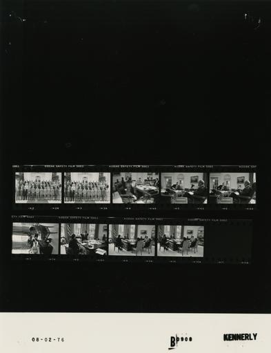 | Keywords: Ford B0908 NLGRF photo contact sheet (1976-07-31)(Gerald Ford Library).jpg White House Photographic Office WHPO is housed at the Gerald R Ford Presidential Library a branch of the National Archives and Records Administration NARA <br/><br/> This file is a 200 dpi photo contact sheet having images from roll of film B0908 of the August 9 1974 - January 20 1977 Gerald R Ford White House Photographic Office Series A0001-A9999 and B0001-B2886 photographs <br/><br/> The date on the photo contact sheet is the date the roll of film was processed not necessarily the date the photographs were taken See table below for additional details 1976-07-31 Gerald R Ford Presidential Library Image http //www fordlibrarymuseum gov/library/whphotos/B0908_NLGRF jpg B0908_NLGRF jpg from http //www fordlibrarymuseum gov/library/whphotos/19760731whpo pdf White House Photographs July 31 1976 of the http //www fordlibrarymuseum gov/Library/whphotos/whpo asp White House Photographic Collection page White House Photographic Office WHPO <br/> Creator David Hume Kennerly PD-USGov Institution Institution Gerald R Ford Presidential Library Table wikitable sortable + Photo contact sheet B0908 U S President Ford Administration Gerald R Ford Library Frame s Tone Subject proper Subject generic Names Geographic Location Photographer Date - 2-3 BW Reunion of Yale University Phi Delta Phi Fraternity standing posing on steps GRF Aller Badger Belin Bellows Berry Brown Burns Caesar Calder Clapp Craig Crawford Deming Dempsey Dilworth Ebersol Ecklund Everdell French Gallagher Galland Gary Hallett Hessberg Hornblower Hutson Keefe Kluttz Lamb Others North Portico -Steps Kennerly 1976-07-31 - 4-10 BW Staff Meeting seated around desk; various angles and distances; all not in every frame GRF Jerry Jones Timmons William Rhatican Stanton Anderson Royston Hughes Oval Office Kennerly 1976-07-31 Gerald R Ford Presidential Library and Museum-cooperation PD-USGov Contact sheets by the Ford White House July 1976 Photographs by David Hume Kennerly from 1976 |