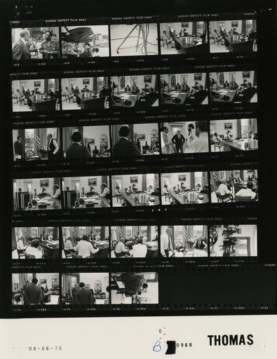 | Keywords: Ford B0968 NLGRF photo contact sheet (1976-08-05)(Gerald Ford Library).jpg White House Photographic Office WHPO is housed at the Gerald R Ford Presidential Library a branch of the National Archives and Records Administration NARA <br/><br/> This file is a 200 dpi photo contact sheet having images from roll of film B0968 of the August 9 1974 - January 20 1977 Gerald R Ford White House Photographic Office Series A0001-A9999 and B0001-B2886 photographs <br/><br/> The date on the photo contact sheet is the date the roll of film was processed not necessarily the date the photographs were taken See table below for additional details 1976-08-05 Gerald R Ford Presidential Library Image http //www fordlibrarymuseum gov/library/whphotos/B0968_NLGRF jpg B0968_NLGRF jpg from http //www fordlibrarymuseum gov/library/whphotos/19760805whpo pdf White House Photographs August 5 1976 of the http //www fordlibrarymuseum gov/Library/whphotos/whpo asp White House Photographic Collection page White House Photographic Office WHPO - Thomas PD-USGov Institution Institution Gerald R Ford Presidential Library Table wikitable sortable + Photo contact sheet B0968 U S President Ford Administration Gerald R Ford Library Frame s Tone Subject proper Subject generic Names Geographic Location Photographer Date - 3A-4A BW Reception Following Presentation of the Presidential Medal of Freedom to Jesse Owens -US Olympic Committee greeting handshaking talking; all not in frames GRF Guests Summer Olympians Cross Hall Thomas 1976-08-05 - 28A-30A BW Meeting During Film Shoot for Republican National Convention standing talking; various angles; Cannon's back to camera inn last 3 frames GRF Cannon Butz Oval Office Thomas 1976-08-06 - 5A BW Thomas 1976-08-06 - 6A-12A BW Meeting During Film Shoot for Republican National Convention seated around desk; various angles and distances GRF Nessen Cheney Marsh Oval Office Thomas 1976-08-06 - 13A-15A BW Meeting During Film Shoot for Republican National Convention standing talking; Cannon's back to camera in last 2 frames; close ups GRF Cannon Oval Office Thomas 1976-08-06 - 16A BW Meeting During Film Shoot for Republican National Convention standing talking Seidman Greenspan Unidentified Oval Office Thomas 1976-08-06 - 17A-25A BW Meeting During Film Shoot for Republican National Convention seated around desk talking; GRF in vest; all in shirtsleeves GRF Seidman Greenspan Oval Office Thomas 1976-08-06 - 26A BW Meeting During Film Shoot for Republican National Convention GRF seated; LWS standing; GRF in vest; all in shirtsleeves GRF Seidman Oval Office Thomas 1976-08-06 Gerald R Ford Presidential Library and Museum-cooperation PD-USGov Contact sheets by the Ford White House August 1976 |