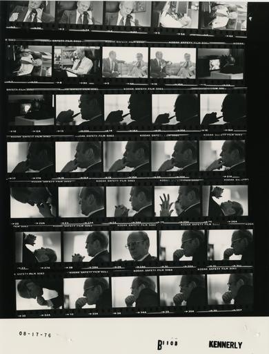| Keywords: Ford B1103 NLGRF photo contact sheet (1976-08-17)(Gerald Ford Library).jpg White House Photographic Office WHPO is housed at the Gerald R Ford Presidential Library a branch of the National Archives and Records Administration NARA <br/><br/> This file is a 200 dpi photo contact sheet having images from roll of film B1103 of the August 9 1974 - January 20 1977 Gerald R Ford White House Photographic Office Series A0001-A9999 and B0001-B2886 photographs <br/><br/> The date on the photo contact sheet is the date the roll of film was processed not necessarily the date the photographs were taken See table below for additional details 1976-08-17 Gerald R Ford Presidential Library Image http //www fordlibrarymuseum gov/library/whphotos/B1103_NLGRF jpg B1103_NLGRF jpg from http //www fordlibrarymuseum gov/library/whphotos/19760817whpo pdf White House Photographs August 17 1976 of the http //www fordlibrarymuseum gov/Library/whphotos/whpo asp White House Photographic Collection page White House Photographic Office WHPO <br/> Creator David Hume Kennerly PD-USGov Institution Institution Gerald R Ford Presidential Library Table wikitable sortable + Photo contact sheet B1103 U S President Ford Administration Gerald R Ford Library Frame s Tone Subject proper Subject generic Names Geographic Location Photographer Date - 2A-4A BW Trip to Kansas City Missouri - Convention seated talking on telephone; close up GRF Kansas City MO Crown Center Hotel - President's Suite -Office Kennerly 1976-08-17 - 5A-8A BW Trip to Kansas City Missouri - Convention seated at desk reading writing; smoking pipe; coatless GRF Kansas City MO Kennerly 1976-08-17 - 9A-10A BW Trip to Kansas City Missouri - Convention - Meeting with Chairman of the New York Republican State Committee seated on sofa talking GRF Rockefeller Kansas City MO Crown Center Hotel - President's Suite Kennerly 1976-08-17 - 11A-12A BW Trip to Kansas City Missouri - Convention seated watching televised convention coverage; smoking holding pipe; taken in silhouette over left shoulder GRF Kansas City MO Crown Center Hotel - President's Suite Kennerly 1976-08-17 - 13A-36A BW Trip to Kansas City Missouri - Convention head and shoulder left side close up portraits; smoking pipe wearing glasses in some frames GRF Kansas City MO Crown Center Hotel - President's Suite Kennerly 1976-08-17 Gerald R Ford Presidential Library and Museum-cooperation PD-USGov Contact sheets by the Ford White House August 1976 Photographs by David Hume Kennerly from 1976 |