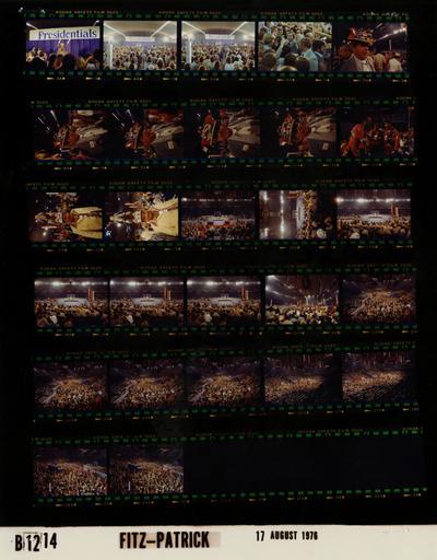 | Keywords: Ford B1214 NLGRF photo contact sheet (1976-08-16)(Gerald Ford Library).jpg White House Photographic Office WHPO is housed at the Gerald R Ford Presidential Library a branch of the National Archives and Records Administration NARA <br/><br/> This file is a 200 dpi photo contact sheet having images from roll of film B1214 of the August 9 1974 - January 20 1977 Gerald R Ford White House Photographic Office Series A0001-A9999 and B0001-B2886 photographs <br/><br/> The date on the photo contact sheet is the date the roll of film was processed not necessarily the date the photographs were taken See table below for additional details 1976-08-16 Gerald R Ford Presidential Library Image http //www fordlibrarymuseum gov/library/whphotos/B1214_NLGRF jpg B1214_NLGRF jpg from http //www fordlibrarymuseum gov/library/whphotos/19760816whpo pdf White House Photographs August 16 1976 of the http //www fordlibrarymuseum gov/Library/whphotos/whpo asp White House Photographic Collection page White House Photographic Office WHPO - Fitz-Patrick PD-USGov Institution Institution Gerald R Ford Presidential Library Table wikitable sortable + Photo contact sheet B1214 U S President Ford Administration Gerald R Ford Library Frame s Tone Subject proper Subject generic Names Geographic Location Photographer Date - 3A-5A Color Trip to Kansas City Missouri - Convention - Coffee with the Presidentials President Ford Committee PFC Youth Group GRF at lectern; crowd in foreground; taken from back of room GRF Presidentials Kansas City MO K C Trade Mart - Youth Hold Center Fitz-Patrick 1976-08-16 - 6A Color Trip to Kansas City Missouri - Convention - Coffee with the Presidentials President Ford Committee PFC Youth Group greeting handshaking milling on floor GRF Presidentials Kansas City MO K C Trade Mart - Youth Hold Center Fitz-Patrick 1976-08-16 - 7A-11A Color Trip to Kansas City Missouri - Convention - Second Session of the Republican National Convention standing; wearing hat with stickers and buttons; wearing Reagan delegate button Reagan Delegate Kansas City MO Kemper Arena - Floor Fitz-Patrick 1976-08-16 - 12A Color Trip to Kansas City Missouri - Convention - Second Session of the Republican National Convention posing; wearing floral shirts and leis Three Hawaiin Delegates Kansas City MO Kemper Arena - Floor Fitz-Patrick 1976-08-16 - 13A-14A Color Trip to Kansas City Missouri - Convention - Second Session of the Republican National Convention wearing hat with buttons and inflatable elephant Delegate Kansas City MO Kemper Arena - Floor Fitz-Patrick 1976-08-16 - 15A-20A Color Trip to Kansas City Missouri - Convention - Second Session of the Republican National Convention talking at lectern; long shots taken from across arena Rockefeller Kansas City MO Kemper Arena Fitz-Patrick 1976-08-16 - 21A-29A Color Trip to Kansas City Missouri - Convention - Second Session of the Republican National Convention on floor; holding signs and placards; wide angle shots taken from higher level Delegates Alternates Kansas City MO Kemper Arena Fitz-Patrick 1976-08-16 Gerald R Ford Presidential Library and Museum-cooperation PD-USGov Contact sheets by the Ford White House August 1976 |