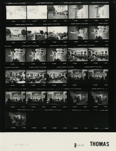 | Keywords: Ford B1619 NLGRF photo contact sheet (1976-09-23)(Gerald Ford Library).jpg White House Photographic Office WHPO is housed at the Gerald R Ford Presidential Library a branch of the National Archives and Records Administration NARA <br/><br/> This file is a 200 dpi photo contact sheet having images from roll of film B1619 of the August 9 1974 - January 20 1977 Gerald R Ford White House Photographic Office Series A0001-A9999 and B0001-B2886 photographs <br/><br/> The date on the photo contact sheet is the date the roll of film was processed not necessarily the date the photographs were taken See table below for additional details 1976-09-23 Gerald R Ford Presidential Library Image http //www fordlibrarymuseum gov/library/whphotos/B1619_NLGRF jpg B1619_NLGRF jpg from http //www fordlibrarymuseum gov/library/whphotos/19760923whpo pdf White House Photographs September 23 1976 of the http //www fordlibrarymuseum gov/Library/whphotos/whpo asp White House Photographic Collection page White House Photographic Office WHPO - Thomas PD-USGov Institution Institution Gerald R Ford Presidential Library Table wikitable sortable + Photo contact sheet B1619 U S President Ford Administration Gerald R Ford Library Frame s Tone Subject proper Subject generic Names Geographic Location Photographer Date - 2A-7A BW Prior to Departure for Andrews Air Force Base and Trip to Philadelphia PA GRF and Bf walking past crowd; crowd and White House in background GRF Betty Ford White House staff South Lawn Thomas 1976-09-23 - 8A-9A BW Departure for Andrews Air Force Base and Trip to Philadelphia PA waving toward Marine One ascending in background ; taken from behind staff; backs of heads in foreground White House staff South Lawn Thomas 1976-09-23 - 10A-14A BW Writer standing posing; on lawn in 1st frame; on driveway in remainder; White House in background Tom Lee South Lawn/Driveway Thomas 1976-09-23 - 15A-19A BW Vickerman Group seated around table; various angles and distances Vickerman Unidentified Group Roosevelt Room Thomas 1976-09-24 - 20A-24A BW Meeting with Press Secretary to the President-Elect of the United Mexican States seated talking Nessen M Gujardo Others Nessen's Office Thomas 1976-09-24 - 25A-27A BW Press Briefing on Progress of Peace Negotiations in Southern Africa GRF on left behind lectern speaking; photographs kneeling in foreground; media on right GRF Media Press Briefing Room Thomas 1976-09-24 Gerald R Ford Presidential Library and Museum-cooperation PD-USGov Contact sheets by the Ford White House September 1976 |