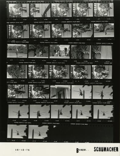 | Keywords: Ford B1828 NLGRF photo contact sheet (1976-10-12)(Gerald Ford Library).jpg White House Photographic Office WHPO is housed at the Gerald R Ford Presidential Library a branch of the National Archives and Records Administration NARA <br/><br/> This file is a 200 dpi photo contact sheet having images from roll of film B1828 of the August 9 1974 - January 20 1977 Gerald R Ford White House Photographic Office Series A0001-A9999 and B0001-B2886 photographs <br/><br/> The date on the photo contact sheet is the date the roll of film was processed not necessarily the date the photographs were taken See table below for additional details 1976-10-12 Gerald R Ford Presidential Library Image http //www fordlibrarymuseum gov/library/whphotos/B1828_NLGRF jpg B1828_NLGRF jpg from http //www fordlibrarymuseum gov/library/whphotos/19761012whpo pdf White House Photographs October 12 1976 of the http //www fordlibrarymuseum gov/Library/whphotos/whpo asp White House Photographic Collection page White House Photographic Office WHPO - Schumacher PD-USGov Institution Institution Gerald R Ford Presidential Library Table wikitable sortable + Photo contact sheet B1828 U S President Ford Administration Gerald R Ford Library Frame s Tone Subject proper Subject generic Names Geographic Location Photographer Date - 3-4 BW Prior to Departure for Andrews Air Force Base standing talking; two suitcases beside Cavaney; Oval Office in background through trees Cavaney Unidentified Friedersdorf South Grounds Schumacher 1976-10-12 - 5-11 BW Prior to Departure for Andrews Air Force Base walking toward camera carrying briefcase; Oval Office in background through trees Cheney South Grounds Schumacher 1976-10-12 - 12 BW Prior to Departure for Andrews Air Force Base walking toward camera papers under left arm; Oval Office in background through trees Cavanaugh South Grounds Schumacher 1976-10-12 - 13 BW Prior to Departure for Andrews Air Force Base walking toward camera; Oval Office in background through trees Raoul-Duval South Grounds Schumacher 1976-10-12 - 14 BW standing talking near Rose Garden hedge Two Secret Service South Grounds Schumacher 1976-10-12 - 15 BW Pet Golden Retriever staff standing talking; dog being held by trainer White House staff Liberty or Misty South Driveway Schumacher 1976-10-12 - 16-18 BW standing talking near Rose Garden hedge Two Secret Service South Grounds Schumacher 1976-10-12 - 19-23 BW Prior to Departure for Andrews Air Force Base walking toward camera; GRF waving toward South Portico not seen ; Mead carrying football ; all not in last frame; Oval Office in background through trees GRF Kennerly Mead Kaiser South Grounds Schumacher 1976-10-12 - 24 BW Prior to Departure for Andrews Air Force Base walking toward camera; papers under left arm; Oval Office in background through trees GRF South Grounds Schumacher 1976-10-12 - 25 BW Prior to Departure for Andrews Air Force Base Stepping into Marine One helicopter GRF South Grounds Schumacher 1976-10-12 - 26-34 BW Departure for Andrews Air Force Base Marine One ascending; Washington Monument in all frames South Grounds Schumacher 1976-10-12 Gerald R Ford Presidential Library and Museum-cooperation PD-USGov Contact sheets by the Ford White House October 1976 |