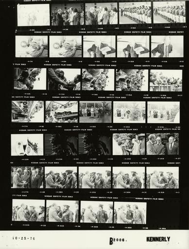 | Keywords: Ford B2006 NLGRF photo contact sheet (1976-10-25)(Gerald Ford Library).jpg White House Photographic Office WHPO is housed at the Gerald R Ford Presidential Library a branch of the National Archives and Records Administration NARA <br/><br/> This file is a 200 dpi photo contact sheet having images from roll of film B2006 of the August 9 1974 - January 20 1977 Gerald R Ford White House Photographic Office Series A0001-A9999 and B0001-B2886 photographs <br/><br/> The date on the photo contact sheet is the date the roll of film was processed not necessarily the date the photographs were taken See table below for additional details 1976-10-25 Gerald R Ford Presidential Library Image http //www fordlibrarymuseum gov/library/whphotos/B2006_NLGRF jpg B2006_NLGRF jpg from http //www fordlibrarymuseum gov/library/whphotos/19761025whpo pdf White House Photographs October 25 1976 of the http //www fordlibrarymuseum gov/Library/whphotos/whpo asp White House Photographic Collection page White House Photographic Office WHPO <br/> Creator David Hume Kennerly PD-USGov Institution Institution Gerald R Ford Presidential Library Table wikitable sortable + Photo contact sheet B2006 U S President Ford Administration Gerald R Ford Library Frame s Tone Subject proper Subject generic Names Geographic Location Photographer Date - 2A-6A BW Campaign Trip to California - Prior to Departure for Seattle Washington handshaking talking saying goodbye; various angles and distances; all not in every frame GRF Unidentified Men; Motorcycle Police Officers San Diego CA Lindbergh Field Kennerly 1976-10-25 - 7A-8A BW Campaign Trip to California - Prior to Departure for Seattle Washington handshaking at base of steps to Air Force One; Officer in background GRF Unidentified Man; Military Officer San Diego CA Lindbergh Field Kennerly 1976-10-25 - 9A-11A BW Flight to Seattle Washington standing laughing; holding pipe in right hand and stack of papers under left arm GRF Air Force One Kennerly 1976-10-25 - 12A-18A BW Campaign Trip to Washington; Arrival in Seattle - Seattle Washington greeting handshaking; GRF reaching over fence; various angles and distances; all not in every frame GRF Secret Service; Crowd Seattle WA Boeing International Airport Kennerly 1976-10-25 - 19A-21A BW Campaign Trip To Washington; Visit to Veterans Administration Hospital; Medal of Honor Tree Planting Ceremony - Seattle Washington GRF holding shovel digging; others in background GRF Jerome Dolezal Richard Murphy Others Seattle WA Veterans Administration Hospital Kennerly 1976-10-25 - 22A BW Campaign Trip to Oregon; Arrival in Portland - Portland Oregon GRF standing in doorway of Air Force One waving GRF Edith Green Portland OR Portland International Airport Kennerly 1976-10-25 - 23A-24A BW Campaign Trip to Oregon; Addressing National Association of Broadcasters NAB Northwestern Region - Portland Oregon GRF speaking at lectern; NAB Members in foreground; taken from back of room; all not in frames GRF; National Association of Broadcasters Northwestern Regional Members Portland OR Sheraton Portland Hotel - Ballroom Kennerly 1976-10-25 - 25A-27A BW Campaign Trip to Oregon; Following Address Before National Association of Broadcasters NAB Northwestern Region - Portland Oregon greeting handshaking standing talking; all not in every frame GRF Others Portland OR Sheraton Portland Hotel - Outside Kennerly 1976-10-25 - 28A-35A BW Campaign Trip to Oregon; Prior to Departure for Pittsburgh Pennsylvania - Portland Oregon handshaking talking saying goodbye; various angles and distances; all not in every frame GRF Police Officers Portland OR Portland International Airport Kennerly 1976-10-25 Gerald R Ford Presidential Library and Museum-cooperation PD-USGov Contact sheets by the Ford White House October 1976 Photographs by David Hume Kennerly from 1976 |