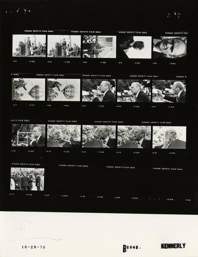 Keywords: Ford B2042 NLGRF photo contact sheet (1976-10-24)(Gerald Ford Library).jpg White House Photographic Office WHPO is housed at the Gerald R Ford Presidential Library a branch of the National Archives and Records Administration NARA <br/><br/> This file is a 200 dpi photo contact sheet having images from roll of film B2042 of the August 9 1974 - January 20 1977 Gerald R Ford White House Photographic Office Series A0001-A9999 and B0001-B2886 photographs <br/><br/> The date on the photo contact sheet is the date the roll of film was processed not necessarily the date the photographs were taken See table below for additional details 1976-10-24 Gerald R Ford Presidential Library Image http //www fordlibrarymuseum gov/library/whphotos/B2042_NLGRF jpg B2042_NLGRF jpg from http //www fordlibrarymuseum gov/library/whphotos/19761024whpo pdf White House Photographs October 24 1976 of the http //www fordlibrarymuseum gov/Library/whphotos/whpo asp White House Photographic Collection page White House Photographic Office WHPO <br/> Creator David Hume Kennerly PD-USGov Institution Institution Gerald R Ford Presidential Library Table wikitable sortable + Photo contact sheet B2042 U S President Ford Administration Gerald R Ford Library Frame s Tone Subject proper Subject generic Names Geographic Location Photographer Date - 2A-3A BW Campaign Trip to California; Campaign Rally in Fountain Valley; Actor - Fountain Valley California GRF standing at lectern on left of frame; others seated on right GRF John Wayne; Platform Guests Fountain Valley CA Fountain Valley Recreation Center Kennerly 1976-10-24 - 4A BW Campaign Trip to California; Campaign Rally in Fountain Valley - Fountain Valley California standing talking at lectern; large flag suspended between two firetrucks in background GRF Fountain Valley CA Fountain Valley Recreation Center Kennerly 1976-10-24 - 5A BW Campaign Trip to California; Campaign Rally in Fountain Valley - Fountain Valley California standing talking at lectern; lclose up; taken from lower vantage point GRF Fountain Valley CA Fountain Valley Recreation Center Kennerly 1976-10-24 - 6A BW Campaign Trip to California - Fountain Valley California close up portrait Scowcroft Fountain Valley CA Fountain Valley Recreation Center Kennerly 1976-10-24 - 7A-8A BW Campaign Trip to California; Campaign Rally in Fountain Valley; Actor - Fountain Valley California riding in limousine; GRF standing talking; red white and blue hot air ballon in background GRF John Wayne Fountain Valley CA Fountain Valley Recreation Center Kennerly 1976-10-24 - 9A-16A BW Campaign Trip to Missouri; Rally in Front of the Old Court House - St Louis Missouri speaking at lectern; close up portraits; various angles GRF St Louis MO Gateway Mall - Luther Ely Smith Memorial Park Kennerly 1976-10-29 - 17A BW Campaign Trip to Missouri; Prior to Departure for Houston Texas - St Louis Missouri handshaking saying goodbye GRF Police Officers Others St Louis MO Lambert Field - Air Force One Kennerly 1976-10-29 Gerald R Ford Presidential Library and Museum-cooperation PD-USGov Contact sheets by the Ford White House October 1976 Photographs by David Hume Kennerly from 1976