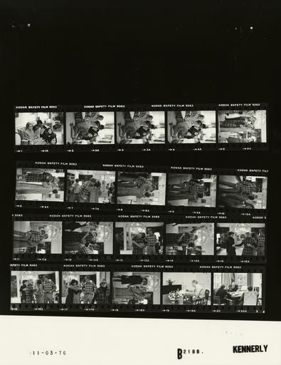 | Keywords: Ford B2188 NLGRF photo contact sheet (1976-11-02)(Gerald Ford Library).jpg White House Photographic Office WHPO is housed at the Gerald R Ford Presidential Library a branch of the National Archives and Records Administration NARA <br/><br/> This file is a 200 dpi photo contact sheet having images from roll of film B2188 of the August 9 1974 - January 20 1977 Gerald R Ford White House Photographic Office Series A0001-A9999 and B0001-B2886 photographs <br/><br/> The date on the photo contact sheet is the date the roll of film was processed not necessarily the date the photographs were taken See table below for additional details 1976-11-02 Gerald R Ford Presidential Library Image http //www fordlibrarymuseum gov/library/whphotos/B2188_NLGRF jpg B2188_NLGRF jpg from http //www fordlibrarymuseum gov/library/whphotos/19761102whpo pdf White House Photographs November 2 1976 of the http //www fordlibrarymuseum gov/Library/whphotos/whpo asp White House Photographic Collection page White House Photographic Office WHPO <br/> Creator David Hume Kennerly PD-USGov Institution Institution Gerald R Ford Presidential Library Table wikitable sortable + Photo contact sheet B2188 U S President Ford Administration Gerald R Ford Library Frame s Tone Subject proper Subject generic Names Geographic Location Photographer Date - 1A-4A BW Election Night Activities seated staring at television not seen ; close ups Betty Ford Gayle Ford Pearl Bailey Pullen Second Floor - West Sitting Room Kennerly 1976-11-02 - 5A-18A BW Election Night Activities BF embracing family members individually and in groups; others in background; various angles and distances; all not in every frame Betty Ford Susan Ford Steve Ford Gayle Ford Others Second Floor - West Sitting Room Kennerly 1976-11-02 - 19A BW Breakfast on Morning After Presidential Election seated at table in bathrobe eating reading newspaper; close up GRF Second Floor - Family Dining Room Kennerly 1976-11-03 - 20A BW Meeting with President Ford Committee PFC Deputy Chairmen seated around desk talking GRF Teeter Cheney Oval Office Kennerly 1976-11-03 Gerald R Ford Presidential Library and Museum-cooperation PD-USGov Contact sheets by the Ford White House November 1976 Photographs by David Hume Kennerly from 1976 |