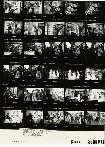 | Keywords: Ford B2588 NLGRF photo contact sheet (1976-12-23)(Gerald Ford Library).jpg White House Photographic Office WHPO is housed at the Gerald R Ford Presidential Library a branch of the National Archives and Records Administration NARA <br/><br/> This file is a 200 dpi photo contact sheet having images from roll of film B2588 of the August 9 1974 - January 20 1977 Gerald R Ford White House Photographic Office Series A0001-A9999 and B0001-B2886 photographs <br/><br/> The date on the photo contact sheet is the date the roll of film was processed not necessarily the date the photographs were taken See table below for additional details 1976-12-23 Gerald R Ford Presidential Library Image http //www fordlibrarymuseum gov/library/whphotos/B2588_NLGRF jpg B2588_NLGRF jpg from http //www fordlibrarymuseum gov/library/whphotos/19761223whpo pdf White House Photographs December 23 1976 of the http //www fordlibrarymuseum gov/Library/whphotos/whpo asp White House Photographic Collection page White House Photographic Office WHPO - Schumacher PD-USGov Institution Institution Gerald R Ford Presidential Library Table wikitable sortable + Photo contact sheet B2588 U S President Ford Administration Gerald R Ford Library Frame s Tone Subject proper Subject generic Names Geographic Location Photographer Date - 3A-13A BW Trip to Colorado - Christmas and Skiing Vacation in Vail CO GRF talking to clerks looking at gifts curios paintings prints ; GRF wearing ski sweater GRF Unidentified male female Store Clerks Vail CO Vail Village Mall -Reflections Gift Shop Schumacher 1976-12-23 - 14A BW Trip to Colorado - Christmas and Skiing Vacation in Vail CO GRF watches as woman wraps gift; GRF wearing ski sweater GRF Unidentified female Store Clerk Vail CO Vail Village Mall -Reflections Gift Shop Schumacher 1976-12-23 - 15A-16A BW Trip to Colorado - Christmas and Skiing Vacation in Vail CO talking laughing; GRF holding wrapped gift in hand; GRF wearing ski sweater GRF Media Vail CO Vail Village Mall -Outside Reflections Gift Shop Schumacher 1976-12-23 - 17A-19A BW Trip to Colorado - Christmas and Skiing Vacation in Vail CO talking laughing; GRF holding wrapped gift in hand; GRF presenting gift to Phil Jones CBS News ; GRF wearing ski sweater GRF Media Vail CO Vail Village Mall -Outside Reflections Gift Shop Schumacher 1976-12-23 - 20A-22A BW Trip to Colorado - Christmas and Skiing Vacation in Vail CO standing talking looking ta sculpture; various angles and distances; all not in every frame; GRF wearing ski sweater GRF Barrett Store Clerk Vail CO Vail Village Mall -Unidentified Store Schumacher 1976-12-23 - 23A BW Trip to Colorado - Christmas and Skiing Vacation in Vail CO GRF leaning over table writing; media looking through window from street; GRF wearing ski sweater GRF Store Clerk Media Vail CO Vail Village Mall -Unidentified Store Schumacher 1976-12-23 - 24A BW Trip to Colorado - Christmas and Skiing Vacation in Vail CO walking down street; talking; GRF wearing ski sweater GRF Secret Service Media; Others Vail CO Vail Street Schumacher 1976-12-23 - 25A BW Trip to Colorado - Christmas and Skiing Vacation in Vail CO GRF seated at table; waitress taking order; GRF wearing ski sweater GRF Shieka Pepi Gramshammer Waitress Media; Others Vail CO Gasthof Gramshammer Schumacher 1976-12-23 - 26A-30A BW Trip to Colorado - Christmas and Skiing Vacation in Vail CO GRF seated at table; talking to young girl; various angles and distances; all not in every frame; waitress serving coffee mugs in last 3 frames; GRF wearing ski sweater GRF Secret Service Waitress Young Girl; Others Vail CO Gasthof Gramshammer Schumacher 1976-12-23 - 31A-32A BW Trip to Colorado - Christmas and Skiing Vacation in Vail CO walking down street; talking; all not in both frames; GRF wearing ski sweater GRF Barrett Media; Others Vail CO Vail Street Schumacher 1976-12-23 Gerald R Ford Presidential Library and Museum-cooperation PD-USGov Contact sheets by the Ford White House December 1976 |