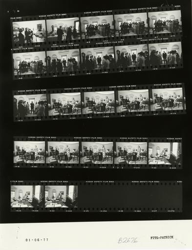 | Keywords: Ford B2676 NLGRF photo contact sheet (1977-01-06)(Gerald Ford Library).jpg White House Photographic Office WHPO is housed at the Gerald R Ford Presidential Library a branch of the National Archives and Records Administration NARA <br/><br/> This file is a 200 dpi photo contact sheet having images from roll of film B2676 of the August 9 1974 - January 20 1977 Gerald R Ford White House Photographic Office Series A0001-A9999 and B0001-B2886 photographs <br/><br/> The date on the photo contact sheet is the date the roll of film was processed not necessarily the date the photographs were taken See table below for additional details 1977-01-06 Gerald R Ford Presidential Library Image http //www fordlibrarymuseum gov/library/whphotos/B2676_NLGRF jpg B2676_NLGRF jpg from http //www fordlibrarymuseum gov/library/whphotos/19770106whpo pdf White House Photographs January 6 1977 of the http //www fordlibrarymuseum gov/Library/whphotos/whpo asp White House Photographic Collection page White House Photographic Office WHPO - Fitz-Patrick PD-USGov Institution Institution Gerald R Ford Presidential Library Table wikitable sortable + Photo contact sheet B2676 U S President Ford Administration Gerald R Ford Library Frame s Tone Subject proper Subject generic Names Geographic Location Photographer Date - 3 BW Meeting with Representatives of the Virginia Slims Tennis Tournament GRF standing near desk holding tennis raquet woman next to GRF back to camera; O'Donnell in background smiling GRF Unidentified Woman; O'Donnell Oval Office Fitz-Patrick 1977-01-06 - 4 BW Meeting with Representatives of the Virginia Slims Tennis Tournament GRF Woman O'Donnell in foreground backs to camera; others in background; all not in frame GRF Unidentified Woman; O'Donnell; Unidentified women I Bentzer J Brinkman L DuPont S Goodwin S Johnson P Kellmeyer O Morazova M Navratilova ML Nellace B Stove M Sevastjanava V Wade V Ziegenfuss ; T Tinling Oval Office Fitz-Patrick 1977-01-06 - 5-8 BW Meeting with Representatives of the Virginia Slims Tennis Tournament standing talking posing GRF Unidentified women I Bentzer J Brinkman L DuPont S Goodwin S Johnson P Kellmeyer O Morazova M Navratilova ML Nellace B Stove M Sevastjanava V Wade V Ziegenfuss ; T Tinling Oval Office Fitz-Patrick 1977-01-06 - 9-13 BW Meeting with Representatives of the Virginia Slims Tennis Tournament standing talking; all not in every frame GRF Unidentified women I Bentzer J Brinkman L DuPont S Goodwin S Johnson P Kellmeyer O Morazova M Navratilova ML Nellace B Stove M Sevastjanava V Wade V Ziegenfuss ; T Tinling Oval Office Fitz-Patrick 1977-01-06 - 14-21 BW Staff Assistant GRF seated at desk; holding lighting smoking pipe; Cavanaugh standing to right of desk GRF Dorothy Cavanaugh Oval Office Fitz-Patrick 1977-01-06 - 22-24 BW Staff Assistant GRF seated at desk; smoking pipe; Cavanaugh standing to right of desk; taken over GRF's left shoulder GRF Dorothy Cavanaugh Oval Office Fitz-Patrick 1977-01-06 Gerald R Ford Presidential Library and Museum-cooperation PD-USGov Contact sheets by the Ford White House January 1977 |