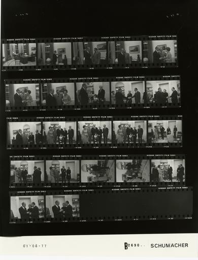 | Keywords: Ford B2690 NLGRF photo contact sheet (1977-01-06)(Gerald Ford Library).jpg White House Photographic Office WHPO is housed at the Gerald R Ford Presidential Library a branch of the National Archives and Records Administration NARA <br/><br/> This file is a 200 dpi photo contact sheet having images from roll of film B2690 of the August 9 1974 - January 20 1977 Gerald R Ford White House Photographic Office Series A0001-A9999 and B0001-B2886 photographs <br/><br/> The date on the photo contact sheet is the date the roll of film was processed not necessarily the date the photographs were taken See table below for additional details 1977-01-06 Gerald R Ford Presidential Library Image http //www fordlibrarymuseum gov/library/whphotos/B2690_NLGRF jpg B2690_NLGRF jpg from http //www fordlibrarymuseum gov/library/whphotos/19770106whpo pdf White House Photographs January 6 1977 of the http //www fordlibrarymuseum gov/Library/whphotos/whpo asp White House Photographic Collection page White House Photographic Office WHPO - Schumacher PD-USGov Institution Institution Gerald R Ford Presidential Library Table wikitable sortable + Photo contact sheet B2690 U S President Ford Administration Gerald R Ford Library Frame s Tone Subject proper Subject generic Names Geographic Location Photographer Date - 8 BW seated at desk looking towards door GRF Oval Office Schumacher 1977-01-06 - 9-11 BW Counsel Voegelin Barton Law Firm - Meeting to Congratulate Mr Mrs Hillings on His Marriage greeting handshaking embracing GRF Patrick Hillings Oval Office Schumacher 1977-01-06 - 12-14 BW Counsel Voegelin Barton Law Firm - Meeting to Congratulate Mr Mrs Hillings on His Marriage greeting handshaking standing posing GRF Mr Mrs Patrick Hillings Oval Office Schumacher 1977-01-06 - 15-18 BW Counsel Voegelin Barton Law Firm - Meeting to Congratulate Mr Mrs Hillings on His Marriage greeting handshaking standing talking; all not in every frame GRF Members of Hillings Family Oval Office Schumacher 1977-01-06 - 19-21 BW Counsel Voegelin Barton Law Firm - Meeting to Congratulate Mr Mrs Hillings on His Marriage standing posing GRF Mr Mrs Patrick Hillings Members of Hillings Family Oval Office Schumacher 1977-01-06 - 22-27 BW Counsel Voegelin Barton Law Firm - Meeting to Congratulate Mr Mrs Hillings on His Marriage standing talking; various angles and distances; all not in every frame GRF Mr Mrs Patrick Hillings Members of Hillings Family Oval Office Schumacher 1977-01-06 - 28-29 BW standing talking GRF Unidentified Man Woman Oval Office Schumacher 1977-01-06 Gerald R Ford Presidential Library and Museum-cooperation PD-USGov Contact sheets by the Ford White House January 1977 |