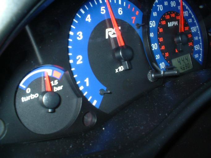 Keywords: Ford Focus RS Boost.jpg Turbo boost dial on Ford Focus RS own 2003-10-06 David Hunt Ford Focus RS Mk I dashboards Automobile gauges