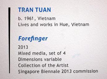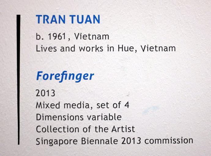 Keywords: forefinger by tran tuan singapore biennale 2013 singapore art museum singaporeartmuseum exhibition art installation public domain publicdomain text Clothed in a dizzying array of exotic materials - such as carved animal bone, cow hide and crocodile leather - Forefinger evokes lavish furniture pieces belonging to the powerful and the wealthy, while drawing attention to the sacrifices of war victims and unresolved post-war trauma. The forefinger is the "trigger finger", vital to every soldier; anti-war activists would cut off their index fingers to avoid military conscription. However, the resulting handicap is perceived by the younger generation as an unwelcome reminder of the inherited baggage of war. In situating one's loss as an accessory of aesthetics and pleasure, Tran highlights the need to reframe the negotiation with the past - the absence of a finger should affirm the presence of the greater fight for peace. www.singaporebiennale.org/artist_tran_tuan.html Clothed in a dizzying array of exotic materials - such as carved animal bone, cow hide and crocodile leather - Forefinger evokes lavish furniture pieces belonging to the powerful and the wealthy, while drawing attention to the sacrifices of war victims and unresolved post-war trauma. The forefinger is the "trigger finger", vital to every soldier; anti-war activists would cut off their index fingers to avoid military conscription. However, the resulting handicap is perceived by the younger generation as an unwelcome reminder of the inherited baggage of war. In situating one's loss as an accessory of aesthetics and pleasure, Tran highlights the need to reframe the negotiation with the past - the absence of a finger should affirm the presence of the greater fight for peace. www.singaporebiennale.org/artist_tran_tuan.html |