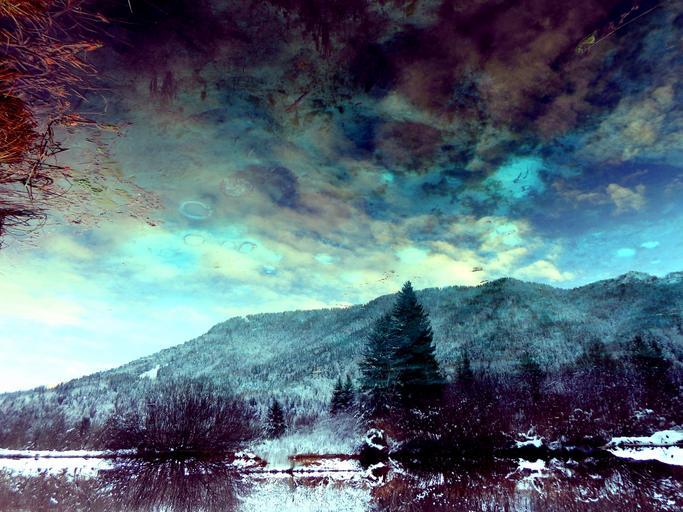 Keywords: forest lake clouds dark purple landscape reflection pine