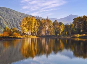 Keywords: forest nature landscape trees yellow gold fairy tale heat reflection river water sky