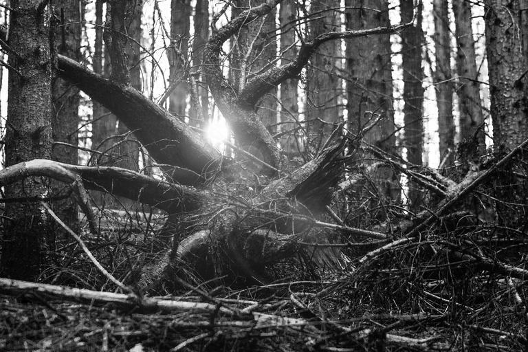 Keywords: forest root light sonner mood black white tree root nature tree tree stump fell down mis shapen back light wilderness