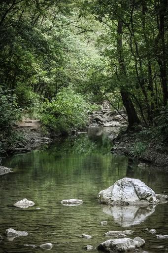 Keywords: forest water green rock stone reflection trees tree stream river torrent