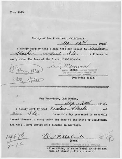 Keywords: Form 2523 certifying marriage under laws of state of California - NARA - 296472.tif Scope and content General notes 296472 Local identifier Department of Justice Immigration and Naturalization Service San Francisco District Office - NARA-Place Japan Asia nation 3137128 36 138 <br /> NARA's Pacific Region San Bruno NRHAS 1000 Commodore Drive San Bruno CA 94066-2350 1915-09-23 Record group Record Group 85 Records of the Immigration and Naturalization Service 1787 - 2004 Record group ARC 414 Immigration Arrival Investigation Case Files compiled 1884 - 1944 documenting the period 1882 - ca 1962 Series ARC 296445 File unit Immigration Arrival Investigation case file for Fumi Akashi wife of Kentaro Akashi 1915 - 1915 File unit ARC 296470 Variant control numbers NAIL Control Number NRHS-85-INSSFARRCAS-14676 9 16-2 yes Other versions <gallery> File Form_2523_certifying_marriage_under_laws_of_state_of_California_-_NARA_-_296472 tif tif File Form_2523_certifying_marriage_under_laws_of_state_of_California_-_NARA_-_296472 jpg jpg </gallery> NARA-cooperation PD-USGov NARA TIF images with categorized JPGs |
