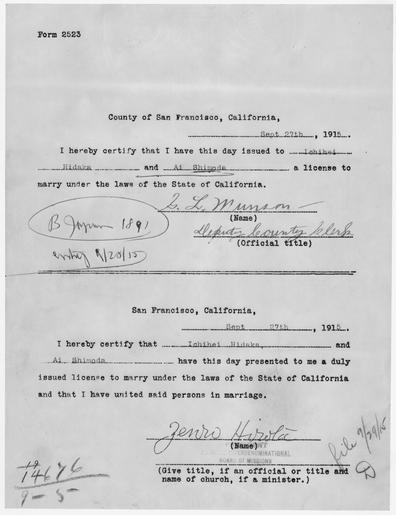 Keywords: Form 2523 certifying marriage under laws of California - NARA - 296465.tif Scope and content General notes 296465 Local identifier Department of Justice Immigration and Naturalization Service San Francisco District Office - NARA-Place Japan Asia nation 3137128 36 138 <br /> NARA's Pacific Region San Bruno NRHAS 1000 Commodore Drive San Bruno CA 94066-2350 1915-09-27 Record group Record Group 85 Records of the Immigration and Naturalization Service 1787 - 2004 Record group ARC 414 Immigration Arrival Investigation Case Files compiled 1884 - 1944 documenting the period 1882 - ca 1962 Series ARC 296445 File unit Immigration Arrival Case File for Ai Hitaka wife of Ichihei Hitaka 1915 - 1915 File unit ARC 296463 Variant control numbers NAIL Control Number NRHS-85-INSSFARRCAS-14676 9 5-2 yes Other versions <gallery> File Form_2523_certifying_marriage_under_laws_of_California_-_NARA_-_296465 tif tif File Form_2523_certifying_marriage_under_laws_of_California_-_NARA_-_296465 jpg jpg </gallery> NARA-cooperation PD-USGov NARA TIF images with categorized JPGs |