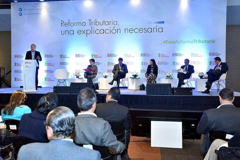 Keywords: La difícil coyuntura económica generada por la caída en los precios del petróleo y la caída de la inversión, entre otros factores, llevó a la necesidad de plantear una reforma tributaria estructural para aumentar el recaudo. Para profundizar y debatir sobre el proyecto presentado por el Gobierno Nacional ante el Congreso de la República, la Fundación Buen Gobierno y la Cámara de Comercio de Bogotá adelantaron este foro con la presencia del Ministro de Hacienda y el director de la DIAN. Expertos tributaristas y representantes de gremios ante más de mil asistentes, debatieron el tema y dieron luces sobre la conveniencia de la reforma. /Crédito CCB. cámara de comercio bogotá