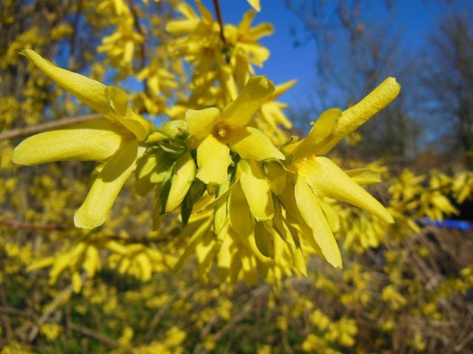 Keywords: forsythia spring shrubs blooming yellow flowers plant kingdom nature close-up sunshine beautiful flowering shrubs yellow green brown