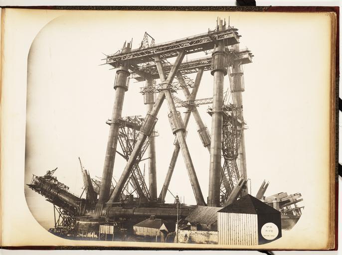 Keywords: Forth Bridge - Fife cantilever from the east side.jpg Photograph of the Fife cantilever from the east side The point from which this view was secured offers absolutely no advantage unless it be variety since owing to the immense height of the structure and the insignificance of the surroundings distortion is inevitable Much progress will be observed in this picture by comparing it with the last taken on this site The joints formed by intersection of struts are only temporarily made and about them are shown first lengths of horizontal lattice girder forming when complete a rectangle some feet above rail level The square angle-iron cages at the extreme end of the bottom member correspond to those employed for a similar purpose on the vertical columns They are surmounted by a 2 ton hydraulic crane of special design These cages travel along the tubes as the riveting progresses being detached and remounted at each joint Transcription from Philip Phillips 'The Forth Railway Bridge' Edinburgh 1890 Size cm 43 58 exhibition history Institution National Library of Scotland photograph object history PD-old-70-1923 Creator Philip Phillips RB l 229 74570336 Forth Bridge - Fife cantilever from the east side Uploaded with GWToolset Forth Bridge - Fife cantilever from the east side http //deriv nls uk/56YK98Q/7443/74438667 2 jpg Construction of the Forth Bridge Images uploaded as part of NLS-WMUK collaboration |