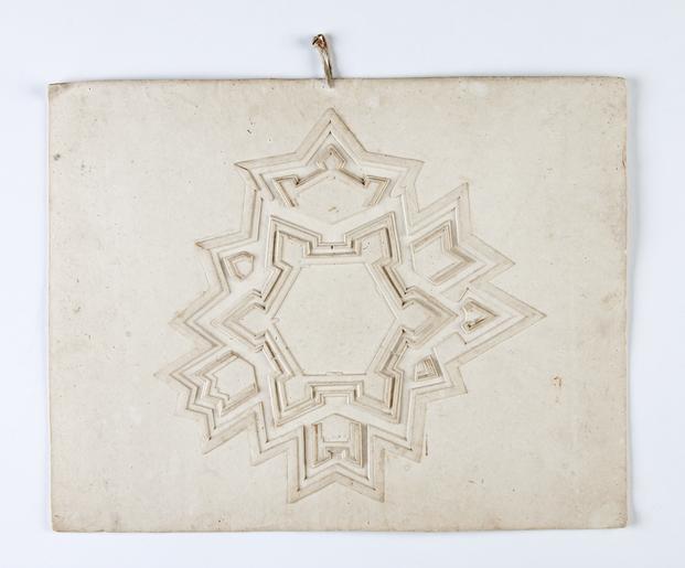 Keywords: Fortifikationsmodell från 1600-talet gjord i papp - Skoklosters slott - 93150.tif LSH artwork sv Modell av skuren och limmad papp Regelbunden fästning med sex bastionerade fronter och yttre verk innanför en oregelbundet 16-uddig vallgrav Huvudvall och lågvall Bastionsvinkeln saillantvinkel 75 grader Flankvinkel <br/> kurtinvinkel 90 grader Portöppningar genom övre nedre högra samt nedre vänstra kurtinen - öppningen i lågvallen något förskjuten åt höger i förhållande till öppningen i högvallen Dubbla sluttande ramper inuti fästningen vid övre högra samt nedre kurtinen enkel ramp rakt ned från den vänstra och snett ned från den övre vänstra bastionen Yttre verk framför varje kurtin samt framför den högra bastionen Medsols från kl 12 räknat konverk enkel tenalj demy-lune ravelin hornverk dubbel tenalj samt bruten ravelin <br/>Bastionmodellens mått h 275 mm b 272 mm <br/>Upphängningsögla av skinn original caption Fortifikationsmodell från 1600-talet gjord i papp <br/> Nyckelord Mätinstrument Föremålsbild Vitt Fortifikationsmodell ca other date - 1600 1650 size mm 403 315 SKO place of origin original filename sm_dig5611 31758 inventory number SKO 10672 93150 CC-BY-SA Fredrik Andersson White models Models of fortifications Fredrik Andersson Media contributed by LSH 2014-11 |