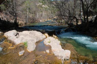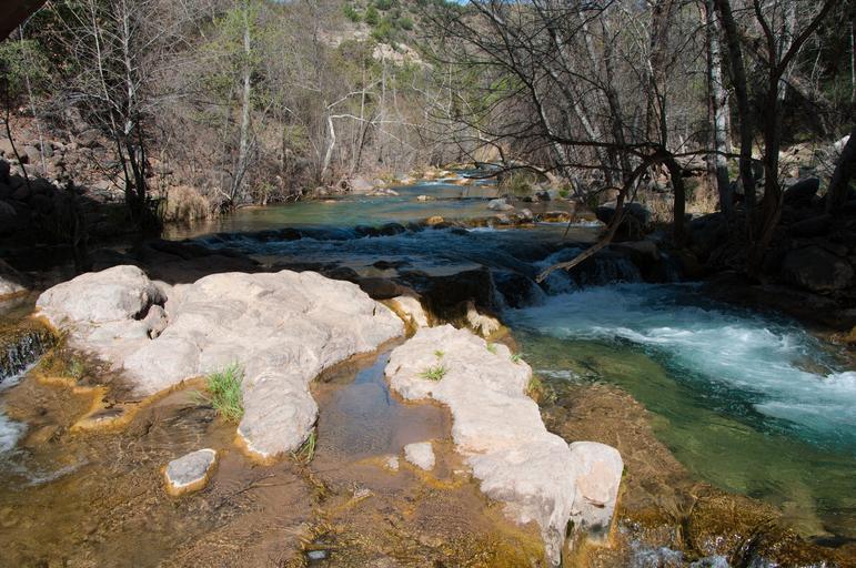 | Keywords: arizona coconino national forest coconinonationalforest forest service forestservice fossil creek fossilcreek red rock ranger district redrockrangerdistrict tonto national forest tontonationalforest usfs canyon creek forest outdoors riparian water camp verde campverde united states unitedstates outdoor landscape stream riverbed river Fossil Creek seems to appear out of nowhere, gushing 20,000 gallons a minute out of a series of springs at the bottom of a 1,600 foot deep canyon. Over the years these calcium laden waters have laid down huge deposits of a type of limestone called travertine. That rock-like substance encases whatever happens to fall into the streambed, forming the fossils for which the area is named. Fossil Creek is one of two "Wild and Scenic" rivers in Arizona. This special designation was achieved when the Irving power plant was decommissioned, and removal of flume and dam on the creek allowed this magnificent creek to once again flow freely through Arizona's arid landscape. Most people come to Fossil Creek to sunbathe, wade, hike and birdwatch. It's also a great place to take photographs. The lushness of the riparian area strikes a sharp contrast to the brittle desert that surrounds it. Increasing popularity has led to the Coconino and Tonto National Forests to implement a parking permit reservation system in 2016. Reserved parking permits give visitors the peace of mind knowing they'll have a spot waiting for them in this remote location. Many visitors drive two or three hours to get to the creek. The final descent to the creek at the bottom of a canyon is on an extremely rough, rocky jeep road. Photo by Deborah Lee Soltesz, March 2, 2016. Credit: USFS Coconino National Forest. Learn more about visiting Fossil Creek, Fossil Springs Wilderness, and the Coconino National Forest. Fossil Creek seems to appear out of nowhere, gushing 20,000 gallons a minute out of a series of springs at the bottom of a 1,600 foot deep canyon. Over the years these calcium laden waters have laid down huge deposits of a type of limestone called travertine. That rock-like substance encases whatever happens to fall into the streambed, forming the fossils for which the area is named. Fossil Creek is one of two "Wild and Scenic" rivers in Arizona. This special designation was achieved when the Irving power plant was decommissioned, and removal of flume and dam on the creek allowed this magnificent creek to once again flow freely through Arizona's arid landscape. Most people come to Fossil Creek to sunbathe, wade, hike and birdwatch. It's also a great place to take photographs. The lushness of the riparian area strikes a sharp contrast to the brittle desert that surrounds it. Increasing popularity has led to the Coconino and Tonto National Forests to implement a parking permit reservation system in 2016. Reserved parking permits give visitors the peace of mind knowing they'll have a spot waiting for them in this remote location. Many visitors drive two or three hours to get to the creek. The final descent to the creek at the bottom of a canyon is on an extremely rough, rocky jeep road. Photo by Deborah Lee Soltesz, March 2, 2016. Credit: USFS Coconino National Forest. Learn more about visiting Fossil Creek, Fossil Springs Wilderness, and the Coconino National Forest. |