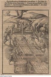 | Keywords: Fotothek df tg 0000596 Metallurgie ^ Probierkunst ^ Gold ^ Goldwäsche ^ Wasserrinne ^ Räder ^ Fass.jpg Scan Deutsche Fotothek df_tg_0000596 color 2007 MIK-Center Berlin GmbH 88960596 Seite 45 Frankfurt Main Bergleute die das zu waschende Gestein in die Goldwaschrinne stürzen A Räder B Bergmann der den Räder bedient C oberes und unteres Gestell der Goldwaschrinne D Planherd E Goldwäscher F Fass G Papier Holzschnitt 18 5 x 13 5 cm Metallurgie Probierkunst Gold Goldwäsche Wasserrinne Räder Fass ppn26446415X 1629 Druck Deutsche Fotothek gefördert von der Deutschen Forschungsgemeinschaft Projekt Technikgeschichte 16 /17 Jh Verwalter Dresden Sächsische Landesbibliothek - Staats- und Universitätsbibliothek Dresden Metall 11 Herstellung Herstellung Tambach Gottfried Verleger aus Ercker Lazarus Buch Beschreibung Allerfürnemisten Mineralischen Ertzt unnd Bergkwercksarten wie dieselbigen vnd eine jede insonderheit jhrer Natur vnd Eygenschafft nach auff alle Metalla probirt vnnd im kleinen Fewer sollen versucht werden mit Erklärung etlicher fürnemmer nützlicher Schmeltzwerck im grossen Fewer auch scheidung Goldts Silbers vnd anderer Metalln Sampt einem Bericht deß Kupffersaigerns Messingbrennens vnd Salpeter siedens auch aller saltzigen Mineralischen Proben vnd was denen allen anhängig Was die Goltwascher auff die Goltwerck gfür ein Probirn und waschen haben SLUB Metall 11 Fotothek-License PD-old-100 Old Manuscripts from the Deutsche Fotothek Mining |