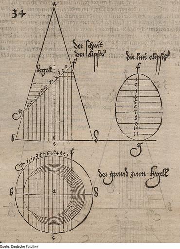 | Keywords: Fotothek df tg 0000674 Geometrie ^ Ellipse ^ Kegel.jpg Creator Albrecht Dürer Scan Deutsche Fotothek df_tg_0000674 color 2007 MIK-Center Berlin GmbH 88960674 Abbildung Nr 34 Arnheim Eliptischer Schnitt eines Drehkegels Papier Holzschnitt 17 x 11 5 cm Geometrie Ellipse Kegel ppn264645545 1604 Druck Deutsche Fotothek gefördert von der Deutschen Forschungsgemeinschaft Projekt Technikgeschichte 16 /17 Jh Verwalter Dresden Sächsische Landesbibliothek - Staats- und Universitätsbibliothek Dresden Art plast 800 misc 1 Herstellung Herstellung Jansen Jan Verleger aus Dürer Albrecht Buch Opera Alberti Dureri Das ist Alle Bücher des weitberühmbten und Künstreichen Mathematici und Mahlers Albrechten Durers von Nürenberg so viel deren von ihm selbst in An 1525 und 1528 kurtz vor und gleich nach seinem todt in Truck geben Nemblich vier von underweisung oder underrichtung der messung mit dem Circkul und Richtscheit in Linien ebenen und gantzen Corporen Item vier von der Proportion deß Menschlichen Corpers und letztlich eins von der Befestigung der Stätt Schlösser und Flecken etc Allen respective Mahlern Steinmetzern Bildthäwern nützlich und nohtwendig Der aller scharffsinnigst Euclides/ hat den grundt der Geometria zusammen gesetzt/ wer den selben wol versteht/ der darff hernach geschrieben ding gar nit/ dann sie sind alleyn den jungen und denen so sonst niemandt haben der sie trewlich underweyst geschryben SLUB Art plast 800 misc 1 Fotothek-License PD-old-100 Conic sections Ellipses Opera Alberti Dureri |