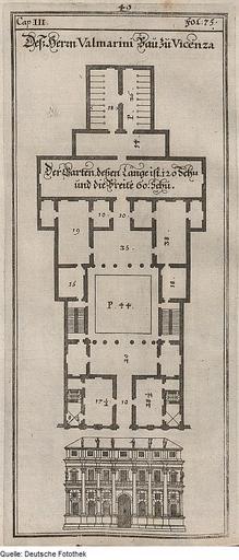 | Keywords: Fotothek df tg 0001665 Architektur ^ Bauwesen ^ Gebäude.jpg Scan Deutsche Fotothek df_tg_0001665 color 2007 MIK-Center Berlin GmbH 88961665 Kap 3 Fig 49 Bl 75 Nürnberg Grundriss und Vorderansicht des Palazzo Valmarana in Vicenza Papier Kupferstich 31 x 13 3 cm Architektur Bauwesen Gebäude ppn26553190X 1698 Druck Deutsche Fotothek gefördert von der Deutschen Forschungsgemeinschaft Projekt Technikgeschichte 16 /17 Jh Verwalter Dresden Sächsische Landesbibliothek - Staats- und Universitätsbibliothek Dresden Archit 188 Herstellung Herstellung Endter Verleger aus Palladio Andreas Böckler Georg Andreas Hrsg Buch Die Baumeisterin Pallas Oder Der in Teutschland entstandene Palladius das ist Des vortrefflich-Italiänischen Baumeisters Andreae Palladii Zwey Bücher Von der Baukunst Deren Erstes I Von denen Materialien die zu dem Bauen insgemein gehören Das Zweyte tractiret I Von denen Zierrathen der gemeinen Gebäue Das III Capitel Von den Stadt-Gebäuen SLUB Archit 188 Fotothek-License PD-old-100 Scans Old Manuscripts from the Deutsche Fotothek |