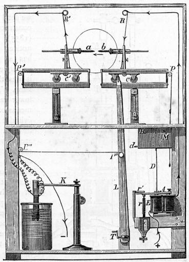 | Keywords: Foucault's regulator.jpg  en Foucault constructed in 1858 the apparatus shown in Fig 426 taken from La Lumière Électrique The two carbons a and b are arranged horizontally fixed upon the rollers c c ² The two springs R R ² tend to move the carbons towards each other and are connected by means of a string running over the pulley P with it so that the motion can take place only when the clockwork M also moves The lever L and the string P ² P ² ² P ² ² ² are so arranged that c and c ² move at the same time only c ² having the negative carbon moves much more slowly than c The electric current before it enters the carbons has to pass the electro-magnet E To the armature A which is movable about r the rod D is fastened; and according to the position which the armature has it will liberate or stop the clockwork The spring r tends to lift the armature from the electro-magnet By means of the catch d the clockwork may be stopped by the hand The voltameter K compensates for variations in the strength of current ; increasing or diminishing the resistance by allowing the plates to take different positions in the fluid When the carbons a and b are at the right distance from each other the current will have its normal strength and the electro-magnet attracts the armature A In this position the rod D stops the clockwork and the carbons remain stationary If the distance of the carbons by means of their consumption becomes too large i e increases the resistance in the circuit the spring r overcomes the force of attraction of the magnet E and the annature A is lifted off; the rod D no longer stops the clockwork and c c ² can move towards each other until the resistance of the circuit has its original value and the arc has its normal length The current will then have its original strength and cause the electro- magnet E to attract the armature A again 1886 Fig 426 at http //www archive org/stream/electricityinse01wormgoog page/n489/mode/1up page 451 in Electricity in the service of man by Alfred Ritter von Urbanitzky edited with copious additions by Richard Wormell Published by Cassell Company 1886 Unknown illustrator PD-old-100 Arc lamps Scans from 'Electricity in the service of man' 1886 |
