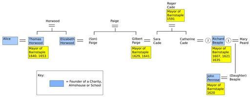 | Keywords: FoundersOfBarnstapleCharities 17thCentury.png en Diagram showing familial connections between the founders of the principal charities almshouses and schools in or around the town of Barnstaple Devon in the 17th century Namely Thomas Horwood founded Horwood's Almshouses in Church Lane A contemporary tablet above the door is inscribed This almshous was founded and endowed by the worshjpful Thomas Horwood Merchant twice mayor of this towne who was a worthy benefactor and began it in his life finished by his wife Mrs Alice Horwood after his death who of her owne accord added the adioyning free schoole and endowed it for 20 poore children for ever 1659 abi et tu fac similiter i e go and do likewise Alice Horwood widow of Thomas Horwood foundress of a girls' school situated next to her husband's almshouse A slate tablet affixed in 1917 above the front door to the present Old School Coffee Shop in Church Lane is inscribed A H 1659 This school for 20 poor maids was founded and built by Alice Horwood Restored 1917 and shows the arms of Horwood Azure a chevron ermine between three hens passant argent winged sable wattled gules in chief a mullet argent for difference Elizabeth Horwood Mrs Paige founder of Paige's Almshouses in Church Lane sister of Thomas Horwood and widow of Gilbert I Paige d 1647 twice Mayor of Barnstaple in 1629 and 1641 Richard Beaple 1564-1643 thrice Mayor of Barnstaple in 1607 1621 and 1635 oversaw the building of Penrose's Almshouses and bequeathed Beaple's Gift as follows Richard Beaple by his will bearing date 13th April 1641 gave to his executors £420 to the intent that they should therewith purchase so much land of inheritance as should be of the yearly value of £20 the yearly profits thereof to be bestowed upon four poor people of the new almshouse erected by Mr John Penrose deceased John Penrose d 1624 Mayor of Barnstaple in 1620 son-in-law of Richard Beaple left money for founding of Penrose's Almshouses in Lichdon Street own work Lobsterthermidor <span class signature-talk ></span> 22 04 11 January 2016 UTC 2015 Barnstaple |