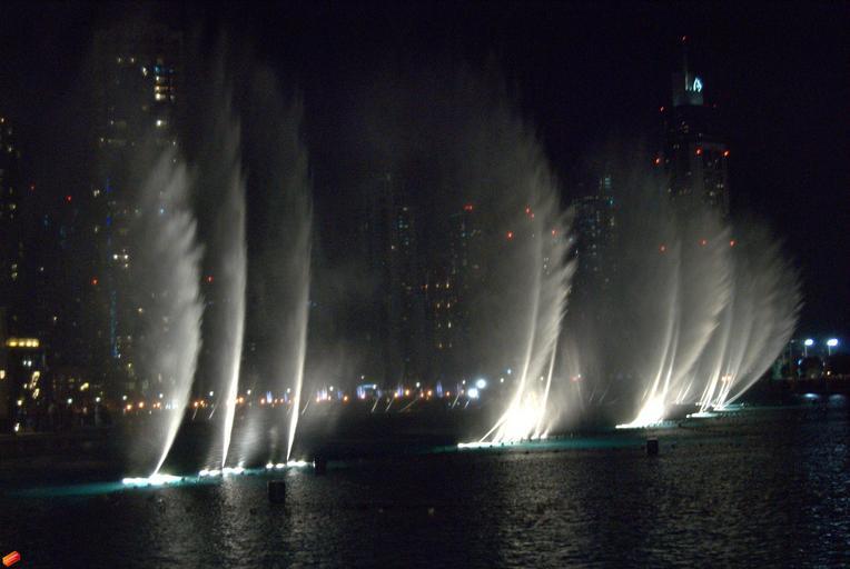Keywords: fountain water fountain city decorative fountains dubai lights architecture building outside evening night landmark beautiful sidewalk artistic