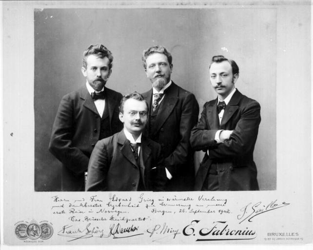 Keywords: edvard grieg edvardgrieg vintage black and white blackandwhite historic norway quatuor schörg quatuorschörg quatuor de bruxelles quatuordebruxelles schörg daucher miry gaillard monochrome groupshot people blackandwhite black and white Artist: unknown Date/place: Bruxelles Subject: Four gentlemen Medium: photographic positive, B&W Notes: Greeting to Edvard & Nina Grieg with signatures under the photo from a visitt in Bergen 26 September 1902 Persistent URL: Original belongs to the Edvard Grieg Archives at Bergen Public Library Original reference: EM Artist: unknown Date/place: Bruxelles Subject: Four gentlemen Medium: photographic positive, B&W Notes: Greeting to Edvard & Nina Grieg with signatures under the photo from a visitt in Bergen 26 September 1902 Persistent URL: Original belongs to the Edvard Grieg Archives at Bergen Public Library Original reference: EM |