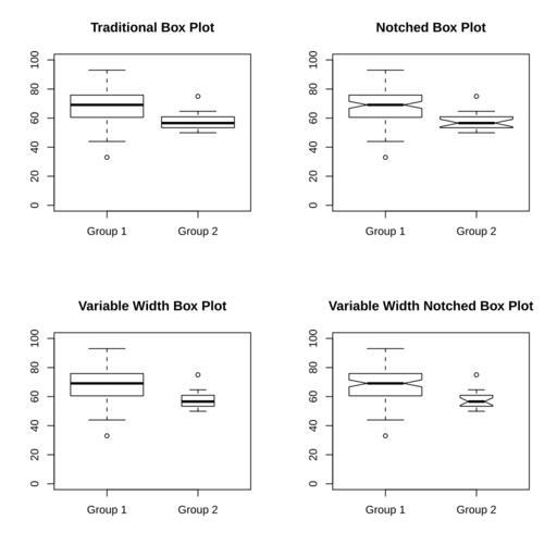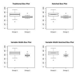 Keywords: Fourboxplots.svg R using two arbitrarily chosen data vectors named data1 and data2 and the following code <pre> par mfrow c 2 2 boxplot data1 data2 ylim c 0 100 names c Group 1 Group 2 notch FALSE varwidth FALSE main Traditional Box Plot boxplot data1 data2 ylim c 0 100 names c Group 1 Group 2 notch TRUE varwidth FALSE main Notched Box Plot boxplot data1 data2 ylim c 0 100 names c Group 1 Group 2 notch FALSE varwidth TRUE main Variable Width Box Plot boxplot data1 data2 ylim c 0 100 names c Group 1 Group 2 notch TRUE varwidth TRUE main Variable Width Notched Box Plot </pre> Exported as pdf then converted to svg in Inkscape 2011-06-28 own Brett Montgomery cc-zero Created with R Created with Inkscape Uploaded with UploadWizard Box plots |