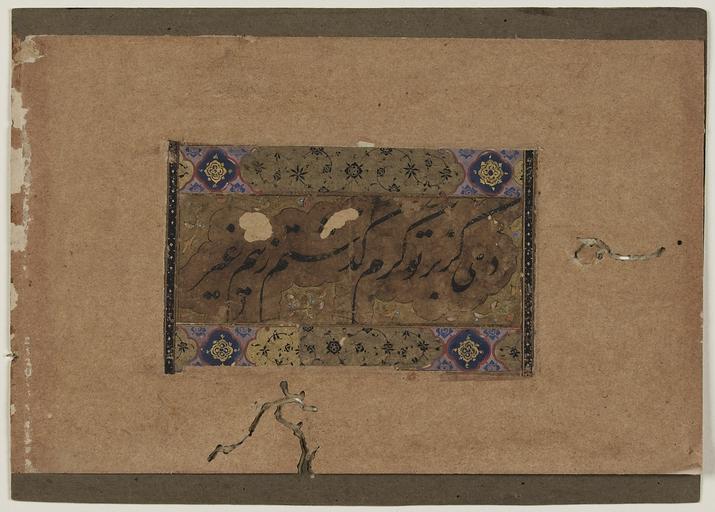 Keywords: Fragmentary Persian Poem WDL6838.png Artwork ru Ф агмент стихотво ения на пе сидском языке fr Poème persan fragmentaire en Fragmentary Persian Poem zh 残缺不全的波斯语诗歌 pt Poema persa fragmentário ar قصيدة فارسية مُجزأة ru Эта небольшая каллиг афическая абота соде жит одну ст оку стихотво ения в кото ой гово ится о тайной ст асти влюбленного человека Вче а я быст о п ошел мимо тебя чтобы ок ужающие ничего не заметили Текст написан письмом насталик че ными че нилами на ко ичневом листе бумаги об амлен облакооб азными полосами и азмещен на золотистом фоне пок ытом тонкими узо ами есколько иллюмини ованных панелей об амляют нижнюю и ве хнюю го изонтальные повехности а слева и сп ава текстовое поле ок ужено ве тикальными деко ативными полосами че ного и золотистого цветов Работа наклеена на лист бумаги большего азме а о анжево- озового цвета с ка тонной подложкой имеющий следы пов еждения че вями Ве оятно текстовая ст ока была создана в Пе сии еще в XV XVI веках в то в емя как деко ативные амки судя по всему были добавлены позднее либо для сох анения данного ф агмента либо с целью ук ашения аботы п едназначенной для включения в альбом с об азцами каллиг афического письма <br>Каллиг афия пе сидская; Иллюмини ование укописей; Пе сидская поэзия; Поэзия fr Ce petit fragment de calligraphie comprend une ligne de poésie décrivant la passion d'un amant secret  « Hier je suis passé à côté de toi rapidement de peur des autres  » Le texte est exécuté en écriture nastaliq noire sur un papier marron Il est encadré de bandes de nuages et placé sur fond doré rempli de motifs décoratifs subtils Plusieurs panneaux enluminés encadrent les lignes horizontales du haut et du bas alors que deux bordures noir et or décorent les lignes verticales droite et gauche du panneau de texte La composition est collée sur une feuille plus grande de papier couleur saumon renforcée par du carton endommagée par des trous causés par des vers Bien que la ligne de texte puisse avoir été exécutée en Perse dès le XV<sup>e</sup> ou le XVI<sup>e</sup> siècle les cadres enluminés semblent avoir été ajoutés ultérieurement soit dans un but de conservation soit pour embellir le fragment avant son intégration dans un album de calligraphies <br>Calligraphie persane; Enluminures; Poésie persane; Poésie en This small calligraphic fragment includes one line of poetry describing a lover's secret passion Yesterday I passed by you quickly for fear of the others The text is executed in black Nasta'liq script on a brown piece of paper and it is framed by cloud bands and placed on a gold background filled with subtle decorative motifs Several illuminated panels frame the top and bottom horizontals while two black and gold borders decorate the right and left verticals of the text panel The composition is pasted to a larger sheet of salmon-colored paper backed by cardboard which is damaged by worm holes Although the line of text may have been executed in Persia as early as the 15th or 16th century the illuminated frames appear to have been added at a later date either for conservation purposes or to embellish a fragment intended for inclusion in an album of calligraphies <br>Calligraphy Persian; Illuminations; Persian poetry; Poetry zh 这是 小幅书法残卷,里 包含 行描述恋人暗藏 情的诗歌: 昨天,我快 走过你身旁,生 被别人发现 文字以黑色波斯体写 褐色的纸张上,字体周围是带状云彩图案,其金色背景上充满了精细的装饰图案 字幅的顶部和底部裱 几个带装饰的水平边框,左右两侧则装饰 两个黑色和金色的垂直边框 此组合 品被粘贴到 张更大的鲑鱼色纸张上,背衬 纸 ,但纸 被虫 破 了 这行文字可能是早于 15 或 16 世纪 波斯完成的,但带装饰的边框似乎是 之后加上去的,目的是 护文字内容或美化此残卷以收录到 个书法 品集中 <br>书法,波斯语; 插图; 波斯诗歌; 诗歌 pt Este pequeno fragmento caligráfico inclui uma linha de poesia que descreve a paixão secreta de um amante Ontem eu passei por ti rapidamente por temer os demais O texto foi escrito em caligrafia nasta'liq na cor preta em um pedaço de papel marrom emoldurado por mosaicos de nuvens e colocado em um plano de fundo dourado preenchido com motivos decorativos sutis Painéis iluminados emolduram as bordas horizontais enquanto duas bordas pretas e douradas decoram as verticais do painel de texto A composição está colada em uma folha maior de papel de cor salmão sustentada por um cartão que está danificado por buracos de traças Embora a linha de texto tenha sido escrita na Pérsia no século XV ou XVI as molduras iluminadas parecem ter sido adicionadas em uma data posterior para fins de conservação ou para tornar mais belo o fragmento que se pretendia incluir em um álbum de caligrafia <br>Caligrafia persa; Iluminuras; Poesia persa; Poesia ar تضم هذه القطعة الخطية بين طياتها سطرًا واحدًا من الشعر يصف شغف العاشق السري بال