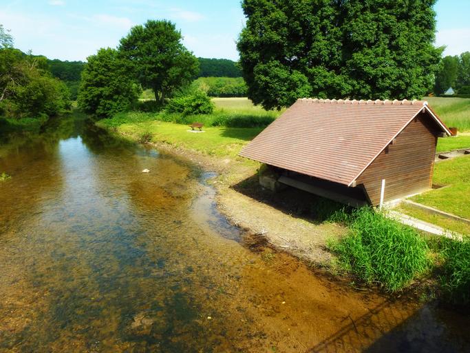 Keywords: france landscape scenic stream water reflections forest trees shelter building nature outside summer spring