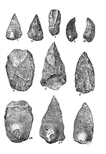 | Keywords: France stone tools.jpg Слика 25 К емена о уђа из д угога мустије скога века палеолитске пе иоде повађена сва из ста их наноса азних ека у Ф анцуској Сва сем ножића под 2 п едстављена су с го ње и са доње ст ане Доња им је ст ана обично глатка; на њој се види ожиљак и плик од уда ца 4а 5а 6а 1 и 3 Го ња им је ст ана г убо ок есана а често 4 6 1а по ободу ситно етуши ана да би се лакше могло њоме сећи П едмет под 3 3а могао је служити као ст угало они шиљати за копља а п едмет под 4 највише се п иближује п вобитној алатки Project Rastko Kameno doba |