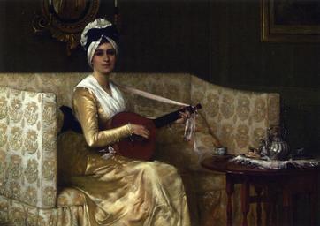 Keywords: Francis Davis Millet - Portrait of MrsMillet.jpg Artwork Creator Francis Davis Millet 1883 oil on canvas cm 40 6 58 4 accession number christies online 5001321 object history Coe Kerr Gallery New York <br/>Private collection Los Angeles California <br/>Acquired by the former owner from the above circa 1988 <br/>sold at Christie ™s New York 29 November 2007 lot 200 credit line exhibition history F D Millet and FD 83 lower left signature and date http //cafe368 daum net/_c21_/bbs_search_read grpid 1FE3g fldid S7BE contentval 0000Azzzzzzzzzzzzzzzzzzzzzzzzz nenc fenc q nil_profile cafetop nil_menu sch_updw cafe368 daum net PD-old-100 DEFAULTSORT Millet Francis Davis; Portrait of Mrs Millet 1883; Christie ™s 2007 Francis Davis Millet Portrait paintings of women 1880s portrait paintings Paintings of sitting women playing musical instruments indoors Couches in art 1883 |