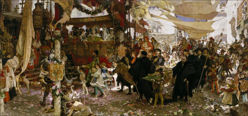 | Keywords: Francisco Pradilla y Ortiz - Cortejo del bautizo del Príncipe Don Juan, hijo de los Reyes Católicos, por las calles de Sevilla.jpg Artwork Creator Francisco Pradilla y Ortiz en The Baptismal procession of Prince Juan son of the Catholic Kings through the streets of Seville 1910 oil canvas cm 193 403 Institution Museo del Prado not on view object history Legacy of María Luisa Ocharán Aburto 1991 credit line accession number P07601 1 source <br/>2 http //www museodelprado es/coleccion/galeria-on-line/galeria-on-line/obra/cortejo-del-bautizo-del-principe-don-juan-hijo-de-los-reyes-catolicos-por-las-calles-de-sevill/ Museo Nacional del Prado PD-old-auto-1923 1921 Francisco Pradilla y Ortiz Spanish Romanesque paintings in the Museo del Prado Catholic Monarchs 1910 paintings |