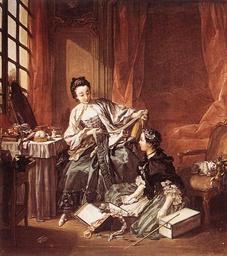 | Keywords: François Boucher - The Milliner (The Morning) - WGA02892.jpg Artwork Creator François Boucher 1746 Oil on canvas size cm 64 53 Institution Nationalmuseum Stockholm object history credit line accession number WGA link 2892 http //www wga hu/art/b/boucher/1/morning jpg http //www wga hu/html/b/boucher/1/morning html PD-old-100 painting genre French 1701-1750 WGA form painting WGA type genre WGA School French WGA time period 1701-1750 Genre scenes by Boucher 1746 Paintings by François Boucher in the Nationalmuseum Stockholm 1746 genre paintings 1746 oil on canvas paintings 1746 paintings from France 18th-century oil paintings of sitting women at full length Chairs in art Cosmetics in art Curtains in art Dressing tables Eye contact in art Fashion in art Females in rooms in art Females with cats in art Milliners Mistress and maid in art People with mirrors in art Robe à la française Rococo interiors Rococo paintings of women People at windows in art People with boxes in art Woman at her toilet |