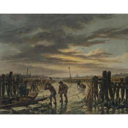 | Keywords: François-Joseph Pfeiffer - Paysage fluvial gelé.jpg Artwork title Frozen river landscape with peasants breaking ice into blocks and the sun setting Paysage fluvial gelé avec des paysans brisant la glace en blocs et le soleil couchant Pen ink watercolor cm 24 5 31 Unknown Private collection http //images artnet com/WebServices/picture aspx date 20061114 catalog 109633 gallery 111531 lot 00212 filetype 2 Artnet century 19 creator François-Joseph Pfeiffer Other versions PD-old-100 François-Joseph Pfeiffer Winter landscape paintings Frozen rivers of the Netherlands Frozen rivers in art 19th-century watercolor paintings Sunsets in art 19th-century genre paintings |