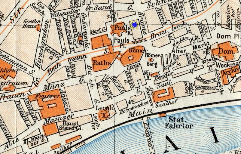 Keywords: Frankfurt Altstadt-Position-Alte Boerse.jpg en Frankfurt on the Main Position of the Alte Boerse Old Stock Exchange as seen on a map of the old town de Frankfurt am Main Lage der Alten Börse auf einer Karte der Altstadt Meyers Großes Konversations-Lexikon Ein Nachschlagewerk des allgemeinen Wissens Sechste gänzlich neubearbeitete und vermehrte Auflage Bibliographisches Institut Leipzig und Wien 1902 “10 Bibliographisches Institut 1904 PD-old Alte Börse Frankfurt Maps from Meyers Konversationslexikon Bibliographisches Institut |