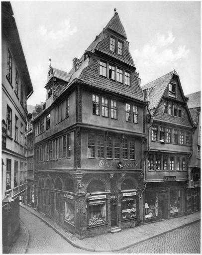 Keywords: Frankfurt Am Main-Fay-BADAFAMNDN-Heft 21-Nr 241-1904-Zur Goldenen Waage Alter Markt -UCSAR.jpg Artwork Creator Carl Friedrich Fay 241 To the Goldene Waage Golden Scale Alter Markt Old Market Hier standen früher zwei Häuser das Eckhaus das als Haus Colmann bezeichnet wurde und das nebenstehende žzur alten Hölle ; im Anfang des 15 Jahrhunderts wurden beide vereinigt und im Laufe des 16 Jahrhunderts taugte der Name žGoldene Waage auf Im Jahre 1450 war eine Trinkstube darin Später erwarb es die Stadt und liess es von dem Architekten von Hoven im alten Stile restauriren Ueber dem aus Sandstein errichteten Erdgeschoss erheben sich zwei in starken Ueberhängen hervorspringende Obergeschosse aus Fachwerk und darüber der zweigeschossige Giebel an der Marktseite ebenfalls Fachwerk zeigend; dieses war aber lange Zeit mit Schiefer überkleidet Das Untergeschoss aus rotem Sandstein gewährt einen überaus schönen Anblick Die Pfeiler sind in Diamantquadern gearbeitet und umschliessen nach dem Markt zu zwei breite Bogenfenster nebst Ladentüre Der Ladenraum war früher ein grosses Gewölbe welches aber später geteilt wurde Die rundbogigen Oberlichter sind mit prächtigem Gitterwerk versehen die auf den Pfeilern ruhenden Tragsteine mit Löwenköpfen geziert Der Tragstein des Eckpfeilers zeigt eine hockende weibliche Figur mit Früchten umgeben <br>In ähnlicher Weise ist die Seite nach der Höllgasse gehalten Die Eckpfeiler der Obergeschosse sind in Holz geschnitzt zeigen aber einfachere Tragsteine Auf der Plattform bildet ein geschieferter schöner Kuppelbau den Ausgang der Wendeltreppe des Treppenturms Auf dem Dache befindet sich die in Heft III No 27 schon dargestellte Dachlaube nebst Brunnen von hier aus erschliesst sich eine überraschende Aussicht nach dem Pfarrturm und der Stadt Die Stuckdecke im Saale des ersten Obergeschosses ist figürlich reich ausgestattet <br>Unser Bild gibt das Haus aus der Zeit wieder als seine Ansicht noch durch die schmale Höllgasse beengt war; jetzt gewährt es durch den Abbruch der ihm gegenüber in engster Entfernung gestandenen Häuser und durch die dadurch bewirkte Freilegung des Domes einen fesselnden und interessanten Anblick 1899 technique collotype dry plate size cm 22 05 17 49 unknown Private collection Mylius Frankfurt am Main object history credit line Uncropped semi-automatically retouched version Unbeschnittene halbautomatisch retuschierte Fassung accession number Carl Friedrich Fay Carl Friedrich Mylius Franz Rittweger Fritz Rupp Bilder aus dem alten Frankfurt am Main Nach der Natur Verlag von Carl Friedrich Fay Frankfurt am Main 1896 “1911 PD-old Bilder aus dem alten Frankfurt am Main Nach der Natur Höllgasse Markt Frankfurt am Main Haus zur Goldenen Waage Demolished buildings in Frankfurt-Altstadt 1899 in Frankfurt am Main |